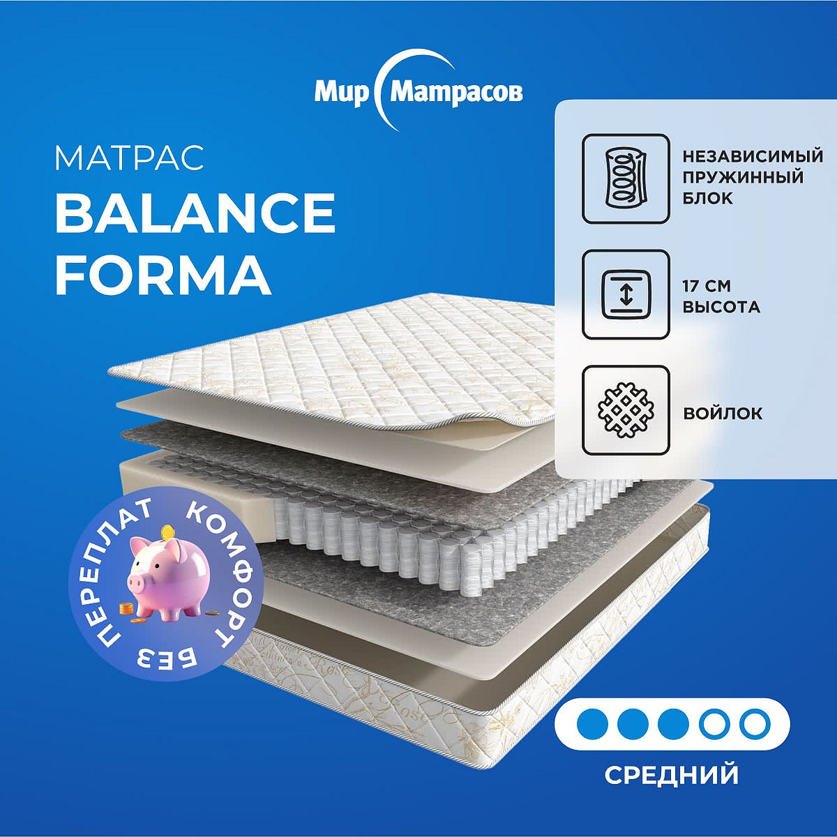 Матрас «Мир матрасов Balance Forma» — средней жесткости, которая комфортна большинству людей среднего телосложения. Это — универсальный выбор и детям, и взрослым, и пожилым людям.