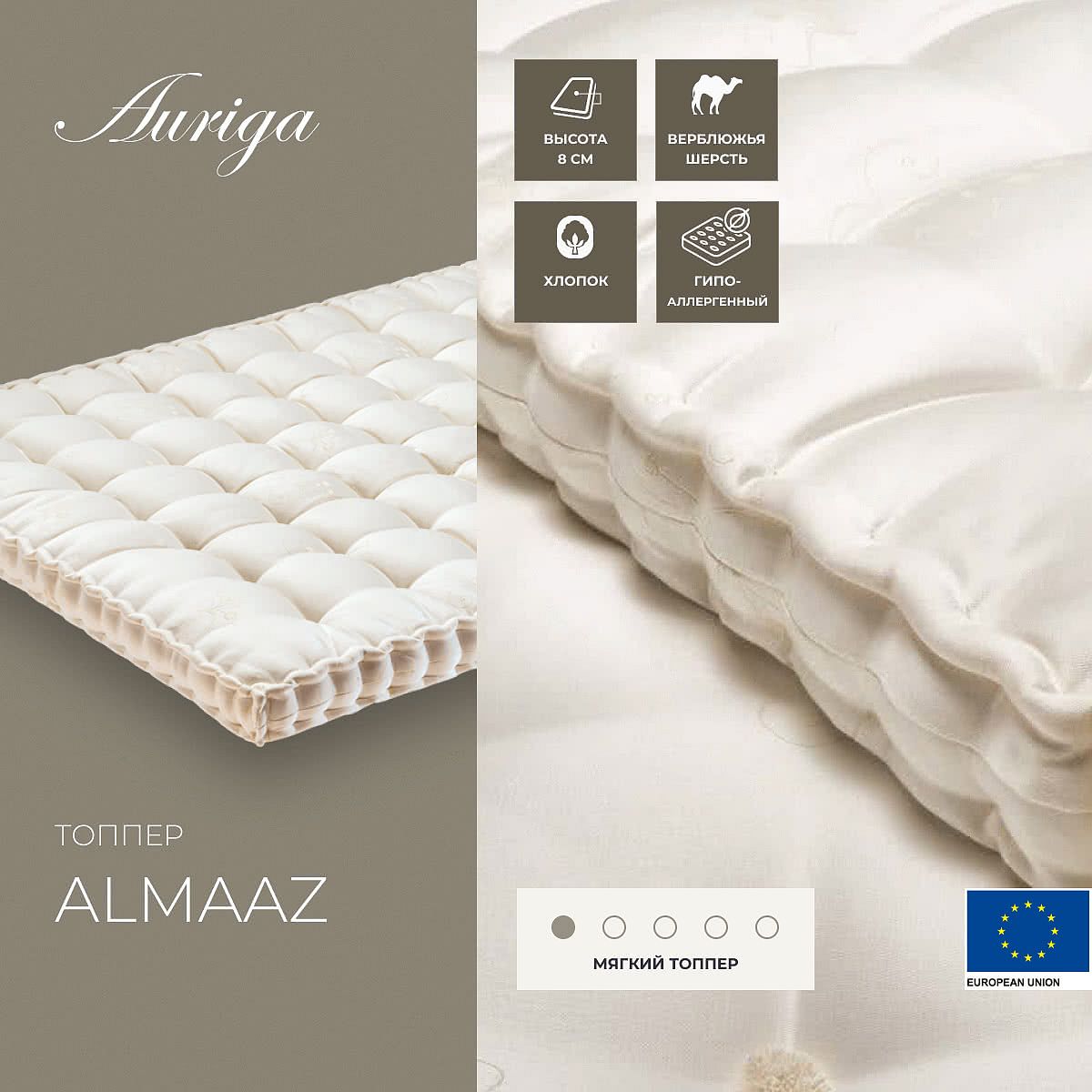 Вертикальная сквозная прошивка предотвращает смещение слоев, сохраняя функциональность топпера на долгие годы и обеспечивая одинаковый комфорт по всей его поверхности. Высота топпера: 8 см. В производстве топперов Auriga используются 100% натуральные материалы, обеспечивающие полный комфорт, а также поддерживающие температуру тела и эффективно впитывающие влагу. При создании товаров для отдыха применяются ручной труд и традиционные способы производства для достижения идеальной отделки каждой детали.