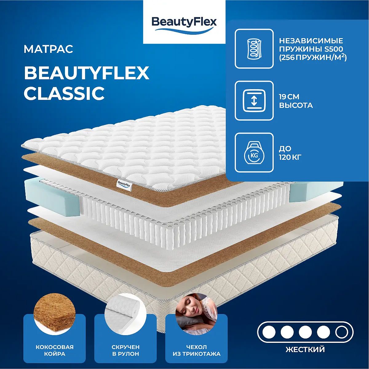 Матрас BeautyFlex Classic — это жёсткий пружинный матрас с независимым пружинным блоком S500 (256 пружин на м2). Такая конструкция обеспечивает точечную поддержку тела и способствует правильному положению позвоночника во время сна. Жёсткость выше средней делает модель подходящей для тех, кто предпочитает упругую поверхность и ощущение стабильности. В составе наполнителя с обеих сторон используется натуральная кокосовая койра толщиной 1 см и защитный слой спанбонда. Это придаёт матрасу дополнительную жёсткость и долговечность. Чехол выполнен из приятного на ощупь трикотажа со стёжкой синтепоном (100 г/м2) и бурлетом из рогожки, что обеспечивает комфорт и аккуратный внешний вид. Высота матраса составляет 19 см, максимальная нагрузка на одно спальное место — до 120 кг. BeautyFlex Classic поставляется в скрученном виде, что облегчает транспортировку и подъём на этаж. Характеристики