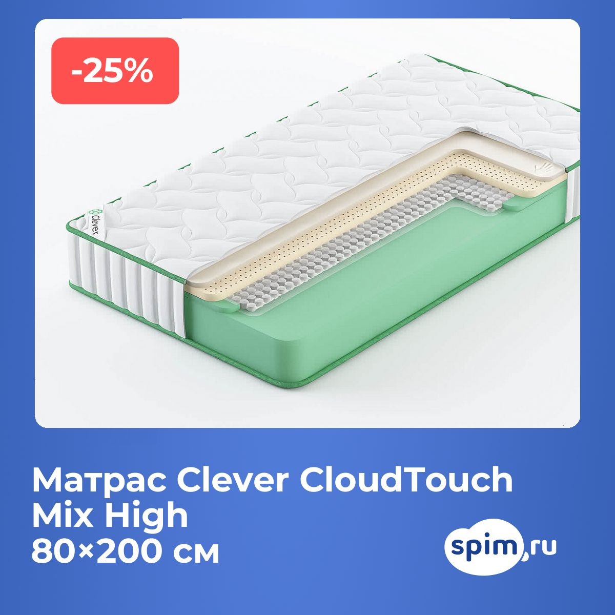 Односпальный матрас Clever CloudTouch Mix High 80х200 подойдет для кроватей с размерами спального места, обозначенными как 80x200 см, 800х2000 мм, 200х80 см, 2000х800 мм (ширина 80 см, длина 200 см).