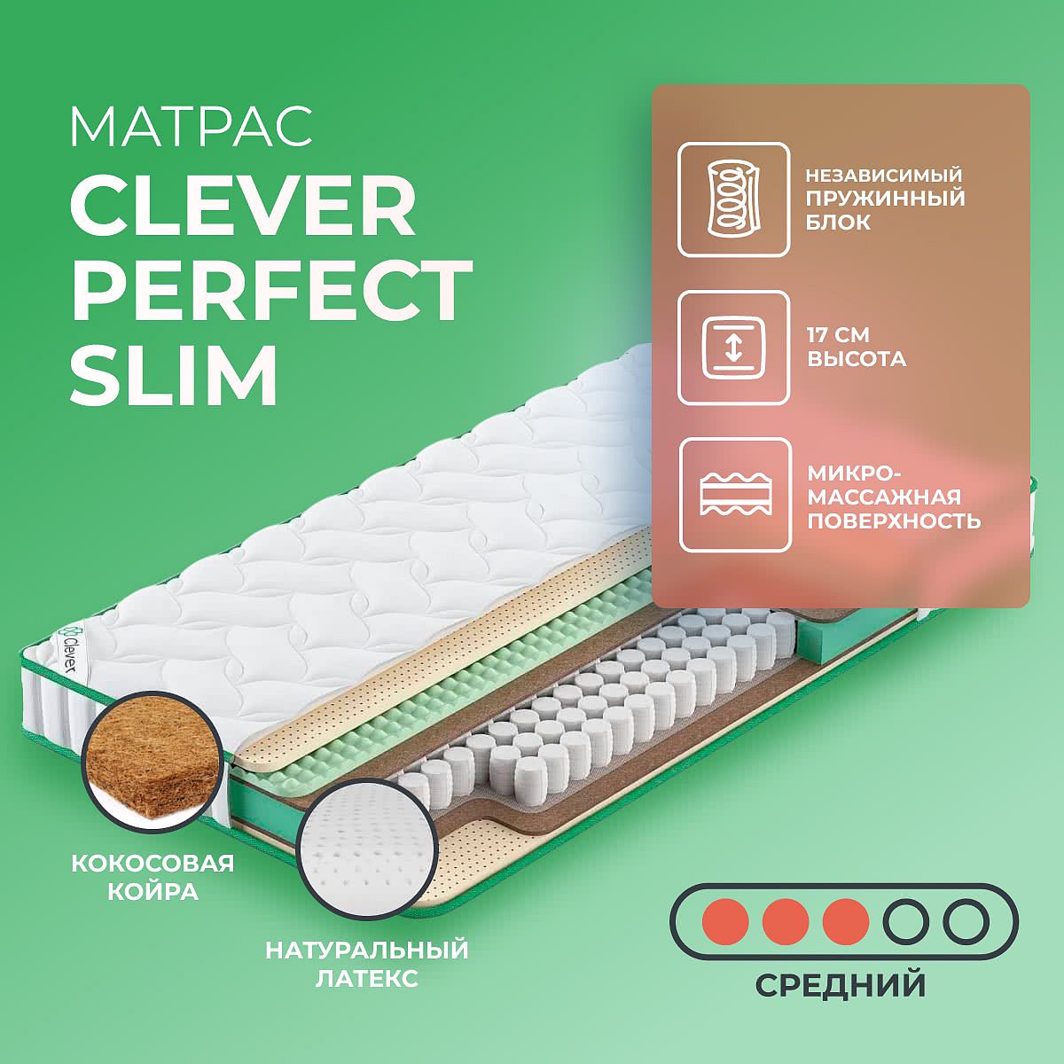 Матрас «Clever Perfect Slim» — средней жесткости, которая комфортна большинству людей среднего телосложения. Это — оптимальный вариант и детям, и взрослым, и пожилым людям.