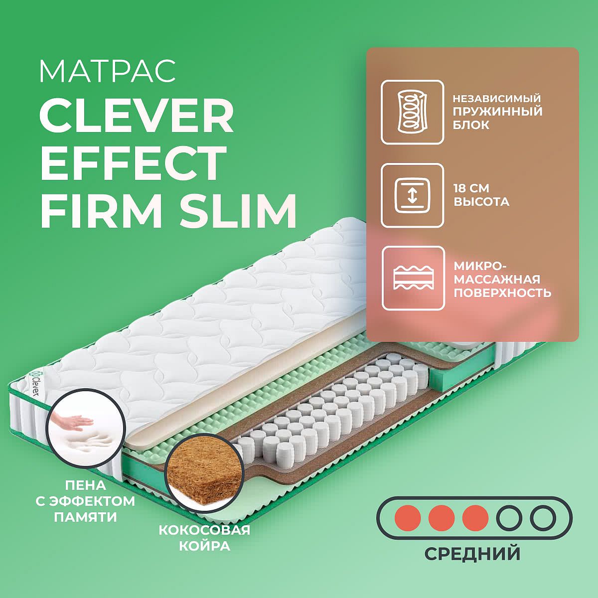 Матрас «Clever Effect Firm Slim» — средней жесткости, которая подходит большинству людей среднего телосложения. Это — оптимальный выбор и детям, и взрослым, и пожилым людям.