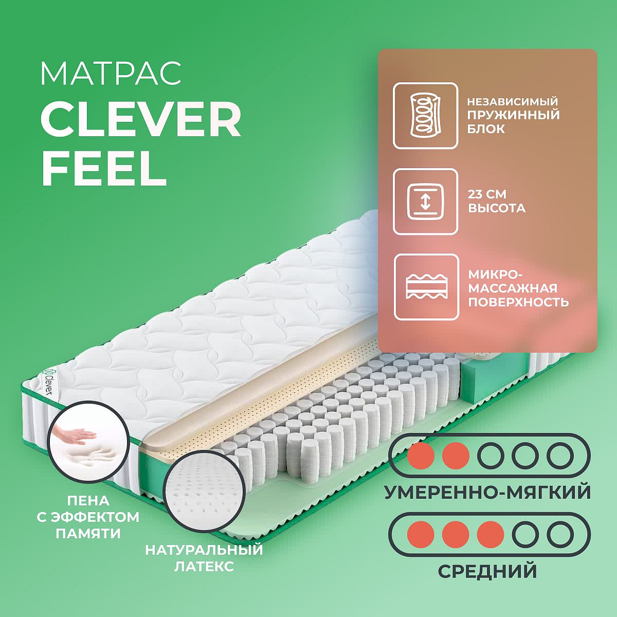 Нагрузка на спальное место, кг: 100. Высота, см: 23. Матрас скручен в рулон. Матрас Feel от бренда Clever построен на современном блоке независимых пружин TFK. Суть работы блока в том, что пружины не имеют жесткой связи друг с другом, а это значит, что будут сжиматься только те пружины, на которых непосредственно оказывается давление. Таким образом, в этом матрасе отсутствует так называемый “эффект гамака”. У матраса две разные стороны по жесткости. Классическая, средне-жесткая сторона выполнена из ячеистого пенополиуретана и обладает микромассажным действием — сон на такой поверхности расслабляет мышцы и снимает напряжение. Материал безвредный, хорошо пропускает воздух и не впитывает влагу. Другая сторона — умеренно мягкая и выполнена с помощью 2х слоев: натурального латекса и материала “Мемори”. Латекс эластичный и упругий, а “Мемори” под действием тепла и давления сжимается и принимает форму человеческого тела “как есть”, тем самым достигается максимальный эффект комфорта и расслабления.