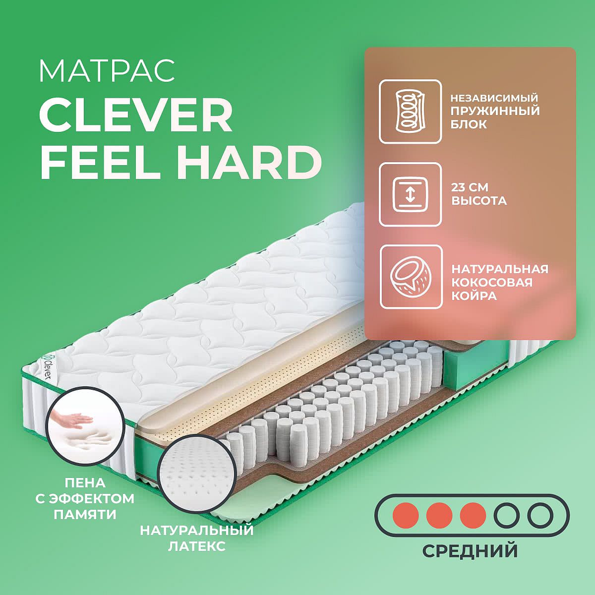 Матрас «Clever Feel Hard» — средней жесткости, которая комфортна большинству людей среднего телосложения. Это — оптимальный вариант и детям, и взрослым, и пожилым людям.