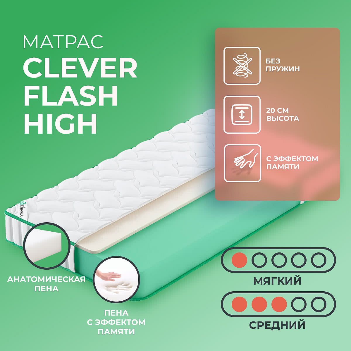 Советы по уходуДля продления срока службы матраса Clever Flash High рекомендуется использовать защитный наматрасник (не входит в комплект). Это поможет сохранить чистоту и свежесть чехла. О производителеБренд Clever — российский производитель современных матрасов, который с 2014 года предлагает удобные решения для сна на основе качественных материалов и продуманной конструкции. Модель Flash High из коллекции Twist — это практичный выбор для ежедневного комфорта.