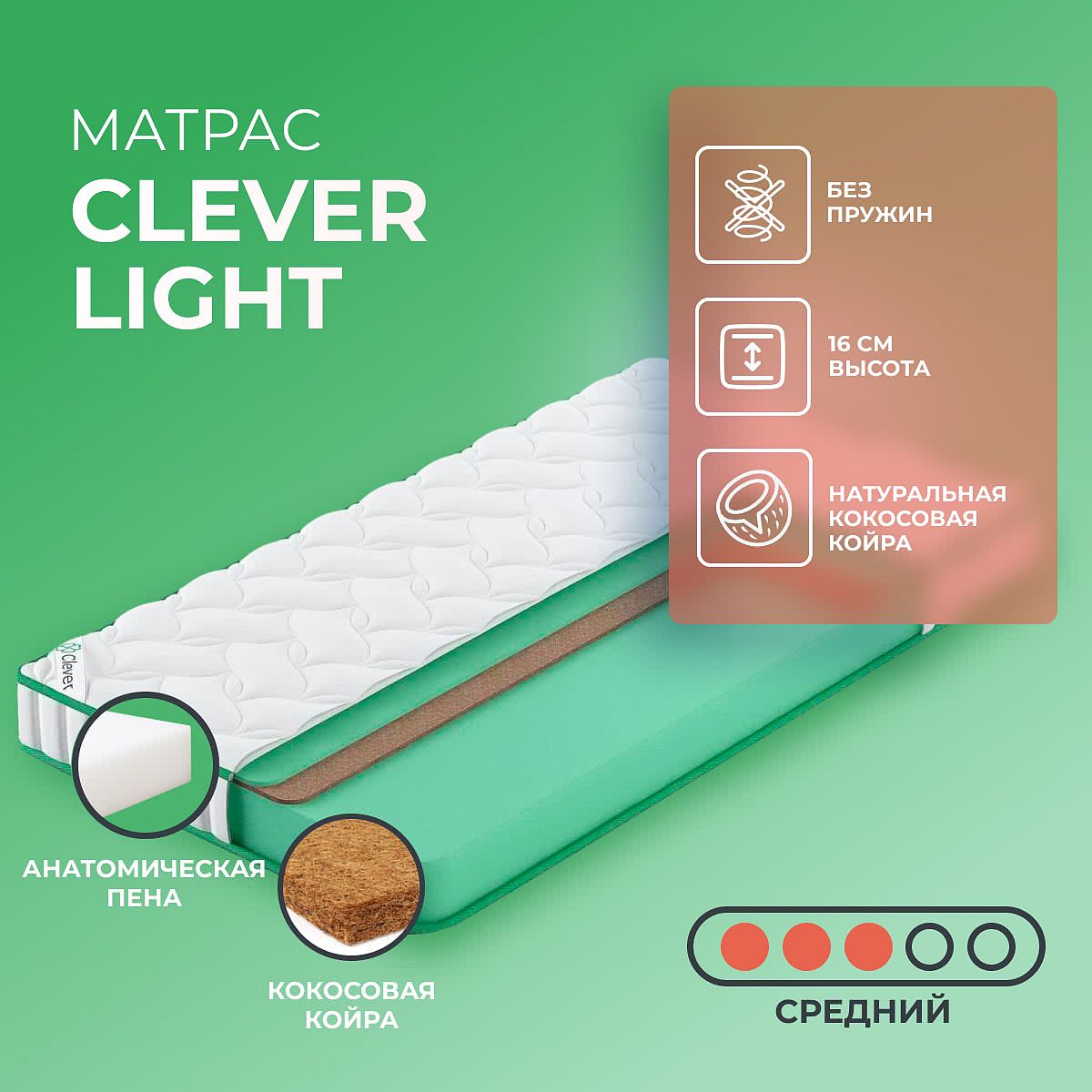 Нагрузка на спальное место, кг: 110. Высота, см: 16. Матрас скручен в рулон. Беспружинный матрас Light от Clever состоит из двух наполнителей: пенополиуретана и кокосовой койры. Пенополиуретановый блок толщиной в 14 сантиметров выполняет роль пружин за счет своей пористой структуры. Обе спальной поверхности этой модели имеют классическую среднюю жесткость. С одной сторона изделие имеет прослойку из кокосовых волокон. Кокос давно признана миром как лучший материал для создания жесткости, обеспечивающей правильную поддержку во время сна. Поверх кокосового слоя проложен пенополиуретан. Такая конструкция ловит двух зайцев: смягчает жесткий кокос и защищает его от от возможных повреждений. Все материалы отвечают последним уровням стандартов: хорошо пропускают воздух, отталкивают влагу и полностью безвредны для человеческого организма.