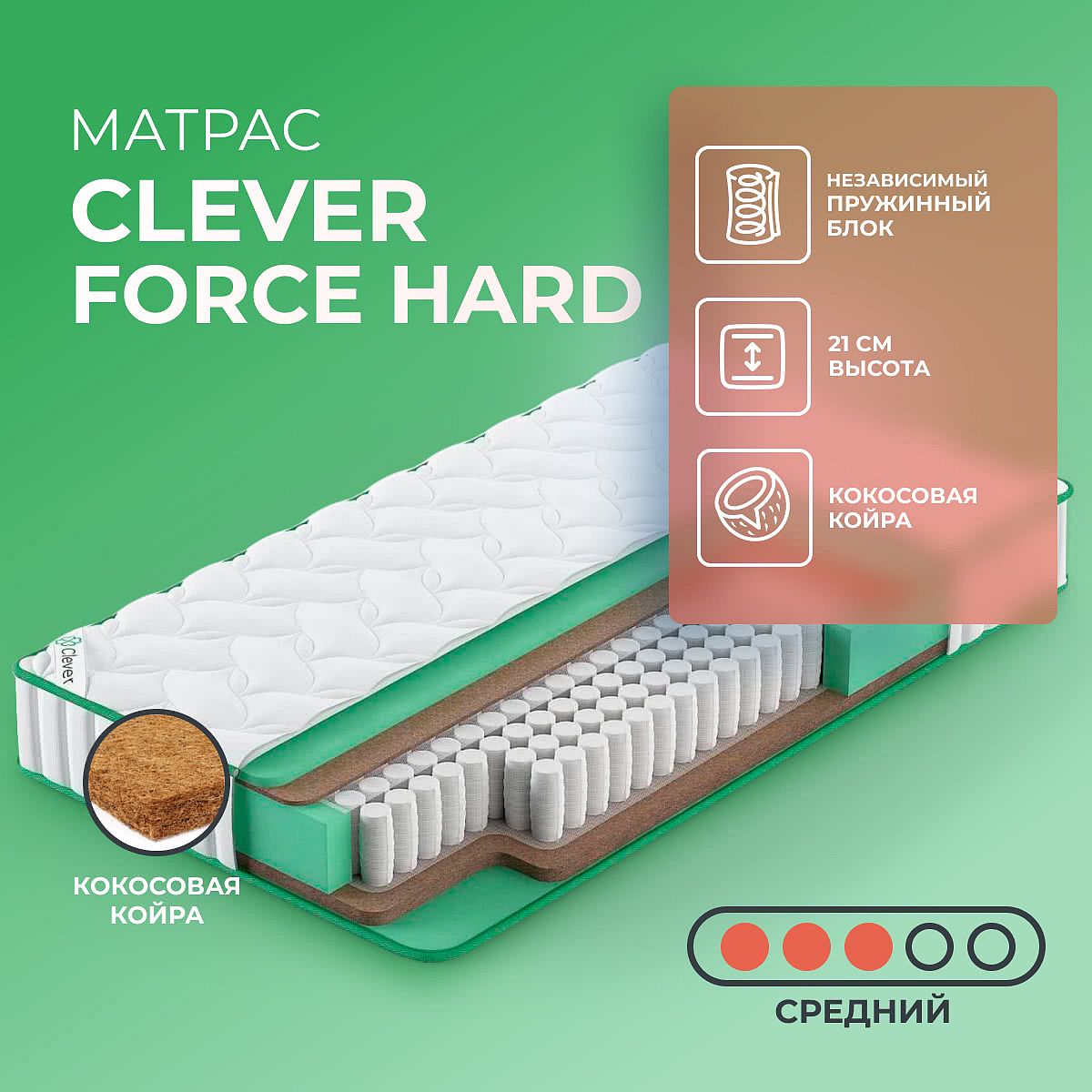 Нагрузка на спальное место, кг: 100. Высота, см: 21. В основе матраса Force Hard от бренда Clever — полноценный пружинный блок не независимых пружинах TFK. Он содержит 500 пружин на каждое спальное место. Блок устроен так, что сжимаются только пружины, которые получили нагрузку. Соседние всегда остаются в разжатом состоянии. Таким образом, идет правильное и точечное распределение нагрузки. С стороны средней жесткости проложены 1 см кокосовой койры и 2 см пенополиуретана. С другой стороны кокоса 3 сантиметра, а пенополиуретана 1 см. Поэтому, вторая поверхность может показаться более упругой и жесткой. Все материалы хорошо пропускают воздух и не впитывают частички влаги.