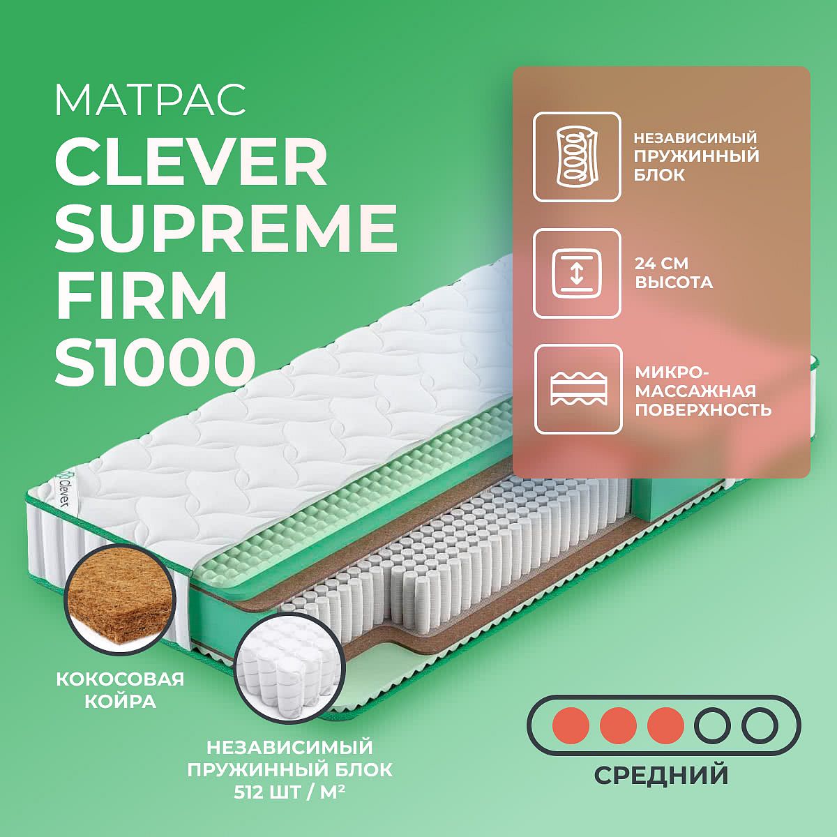 Матрас «Clever Supreme Firm S1000» — средней жесткости, которая комфортна большинству людей среднего телосложения. Это — универсальный выбор и детям, и взрослым, и пожилым людям.