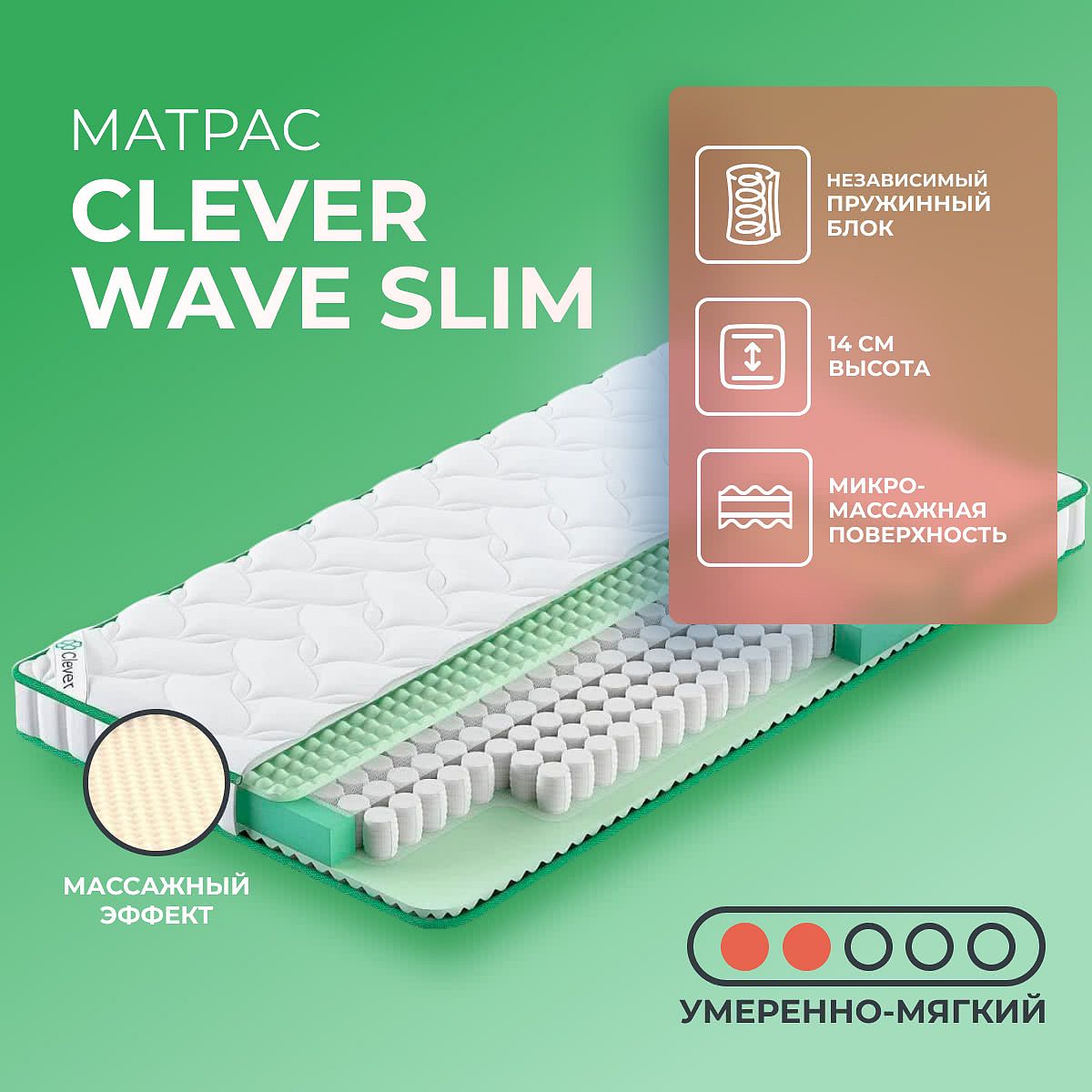 Матрас Clever Wave Slim подойдёт для тех, кто ценит мягкость, но при этом желает сохранить необходимую поддержку для ежедневного отдыха. Подходит для небольших спален, детских и гостевых комнат, а также для дачи. Мягкая поверхность с микромассажным эффектом способствует расслаблению и помогает снять напряжение. УходДля продления срока службы рекомендуется использовать защитный наматрасник (в комплект не входит). О производителеБренд Clever Mattress выпускает качественные матрасы на собственном производстве в России, сочетая современные материалы и практичные решения для сна.