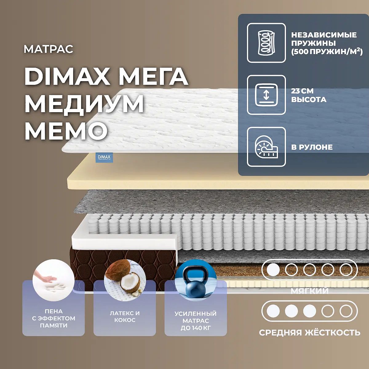 Уровень жесткости: низкий/средний. Три материалаВ основе этой модели 3 наполнителя: кокосовая койра, натуральный латекс и материал с эффектом памяти формы. Все эти наполнители экологически чистые и безопасны для здоровьа и сна, они проходят множество проверок на качество.Наполнение моделиОдна сторона модели выполнена из мемориформ. Главной его особенностью является способность запоминать форму и повторять ее после полученной нагрузки. Это уникальное свойство позволяет мемориформ создавать комфорт, максимально расслаблять, снимать напряжение и устранять боль в различных точках тела. С другой стороны проложены слои кокосовой койры и натурального латекса. Оба материала имеют натуральную основу и никаких посторонних вредных примесей. Кокос создает натуральную жесткую основу для позвоночника, позволяет телу принимать естественное положение во время сна. Латекс мягко обволакивает и расслабляет тело, позволяет снимать напряжение в мышцах и суставах.Действие пружин S1000Модель базируется на пружинном блоке независимых пружин – S1000. В такой конструкции 500 пружин занимают 1 кв. метр спальной поверхности. Каждая пружина упакована в чехол и действуют автономно, никак не соприкасаясь с соседней. Пружины имеют форму бочонков, они воздействуют точечно и равномерно распределяют и нагрузку по поверхности. По периметру такой блок усилен слоем пенополиуретана.Чехол из трикотажаЧехол изготовлен из нежного и мягкого трикотажа. Обивка передаёт матрасу дополнительный комфорт и дарит приятный контакт с поверхностью. Спальные стороны украшены объемной стежкой по двум наполнителям – ППУ и холлкону, что гарантирует матрасу не только дополнительную мягкость, но и создаёт очень уютное место сна.Боковая часть чехла, выполненная из коричневой мебельной ткани со стежкой по ППУ, обеспечивает надежную защиту и дополнительную износостойкость. Рекомендованная нагрузка на матрас – до 140 кг на спальное место, высота изделия – 23 см. Защита матрасаДля защиты поверхности от пятен от пролитых жидкостей, грязи и пыли рекомендуем купить дополнительно защитный чехол или водонепроницаемый наматрасник.Другие моделиПосмотрите также другие модели этой серии: Dimax Мега Мемо Хард, Dimax Мега Мемо Софт.Скрутка в рулонПо умолчанию матрас поставляется в развернутом виде. По вашему желанию матрас может быть доставлен в скрученном виде.При доставке транспортной компанией матрас всегда скручивается в рулон. Хранение матрасов в скрутке должно осуществляться: