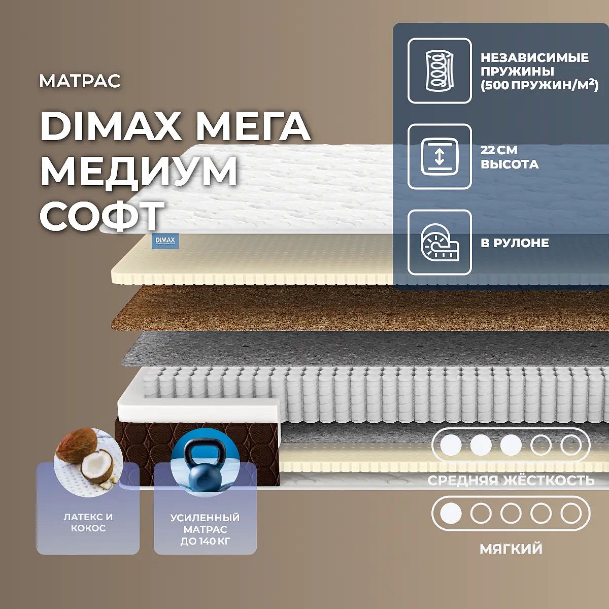 Уровень жесткости: средний/низкий. Мягкий расслабляющий материалМодель Мега Медиум Софт имеет двустороннее наполнение и дополнительно усилена слоем натурального латекса, за счет чего одна сторона модели мягкая. Натуральный латекс обеспечивает максимальный комфорт на поверхности, он очень мягкий и эластичный. Латекс получают из млечного сока дерева Гевея: собирают и вспенивают особым образом. Готовая смесь проходит дальнейшую обработку и получается упругий и прочный наполнитель, который абсолютно безопасен для человека.Сочетание кокоса и латексаДругая сторона модели выполнена на основе сочетания латекс-кокос. Кокос - также природный материал только, наоборот, очень жесткий и плотный. Кокос получают из волокон кокосовой пальмы: сухие волокна его обрабатывают и пропитывают соком латекса. За счет чего материал получается эластичный и прочный. Волокна хорошо проводят воздух и препятствуют проникновению влаги внутрь матраса. Латекс добавляет поверхности дополнительную упругость и смягчает жесткий кокос.Действие пружин S1000В основе модели лежит пружинный блок независимой конструкции - S1000. В нем на 1 кв. метре по 500 микропружин и каждая помещена в специальный чехол из прочного и износостойкого материала. Пружины имеют одинаковую форму, они точечно воспринимают нагрузку и распределяют нагрузку равномерно по всей поверхности.Чехол из трикотажаЧехол матраса выполнен из нежного трикотажа с супер-объемной стежкой по сразу двум наполнителям – ППУ и холлкону. Союз материалов обеспечивает очень мягкие и приятные соприкосновения с телом, усиливая ощущение комфорта.Бурлет выполнен из мебельной ткани тёмно-коричневого цвета, простеганной на ППУ. Материал обладает повышенной износостойкостью и придает матрасу стильный облик. Обивка формирует комфортную и здоровую зону для сна, которая позволит вам расслабиться и отдохнуть после трудного дня. Рекомендованная нагрузка – до 140 кг на спальное место и имеет в высоту 22 см. Защита матрасаДля защиты поверхности от пятен от пролитых жидкостей, грязи и пыли рекомендуем купить дополнительно защитный чехол или водонепроницаемый наматрасник.Другие моделиПосмотрите аналогичные жесткие модели: Dimax Мега Медиум Хард, Dimax Мега Хард.Скрутка в рулонПо умолчанию матрас поставляется в развернутом виде. По вашему желанию матрас может быть доставлен в скрученном виде.При доставке транспортной компанией матрас всегда скручивается в рулон. Хранение матрасов в скрутке должно осуществляться: