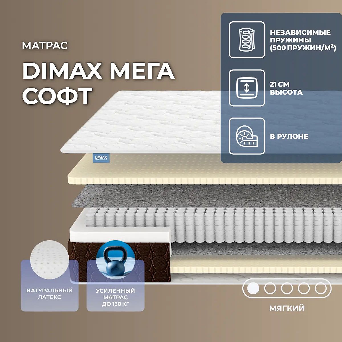 Уровень жесткости: низкий. Наполнение моделиВ качестве материала для данной модели используется натуральный латекс. Это наполнитель повышенного комфорта и мягкости. Он нежно обволакивает тело спящего и позволяет ему расслабляться, снимает напряжение и стресс. Материал гипоаллергенный и абсолютно безопасный для человека.Действие пружин S1000Модель строится на блоке независимых пружин S1000. В такой конструкции все пружины изолированы друг от друга и действуют автономно. Каждая пружина помещена в специальный чехол из прочной и износостойкой ткани. Нагрузка в такой конструкции распределяется равномерно, спящий испытывает максимальный комфорт и расслабление. По периметру такой блок усилен слоем пенополиуретана.Чехол из трикотажаЧехол матраса выполнен из нежного трикотажа с очень объемной стежкой по ППУ и холлкону. Материал чехла очень мягкий и приятный к телу, а двойной наполнитель обеспечивает комфортный сон, словно на облаке.Боковая часть чехла изготовлена из мебельной ткани цвета шоколада с простежкой по слою ППУ. Контрастный бурлет придает матрасу стильный облик и повышенную износостойкость. В сочетании с качественными материалами и пружинным блоком, чехол создает уютную и здоровую поверхность для сна. Рекомендованная нагрузка для матраса – до 130 кг на спальное место. Высота спальной принадлежности – 23 см. Защита матрасаДля защиты поверхности от пятен от пролитых жидкостей, грязи и пыли рекомендуем купить дополнительно защитный чехол или водонепроницаемый наматрасник.Другие моделиПосмотрите аналогичные жесткие модели: Dimax Мега Медиум Хард, Dimax Мега Хард.Скрутка в рулонПо умолчанию матрас поставляется в развернутом виде. По вашему желанию матрас может быть доставлен в скрученном виде.При доставке транспортной компанией матрас всегда скручивается в рулон. Хранение матрасов в скрутке должно осуществляться: