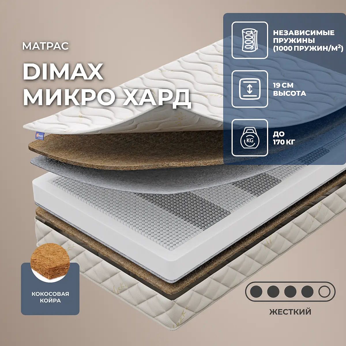 Уровень жесткости: высокий. Нагрузка, кг: 170. Высота, см: 19. Действие пружин S2000Основу конструкции составляет независимый пружинный блок S2000. Это система, которая объединяет по 1000 микропружин, расположенных на 1 кв. метре. Пружины очень маленькие, они помещены в отдельные чехлы из прочного и износостойкого материала повышенной прочности. Нагрузка в таком блоке распределяется равномерно и создается повышенный уровень комфорта.Жесткая поддержка кокосаПовышенную жесткость матрасу придает наличие кокосовой койры . Это природный и материал, он изготавливается из сухих волокон. Волокна хорошо пропускают воздух и быстро сохнут, поэтому такая поверхность гигиеничная. Кокос не имеет запаха, он абсолютно безопасен для здоровья и сна.Чехол из трикотажаЧехол модели изготавливается из трикотажа с комфортным слоем.Защита матрасаДля защиты поверхности от пятен от пролитых жидкостей, грязи и пыли рекомендуем купить дополнительно защитный чехол или водонепроницаемый наматрасник.Другие моделиЭта модель жесткая, посмотрите также мягкие модели этой серии: Dimax Микро Софт, Dimax Микро Софт Люкс.Матрас поставляется в полном размере. Скрутить этот матрас невозможно.