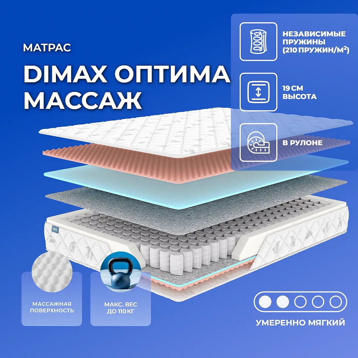Средне-мягкий матрас «Dimax Оптима Массаж» — для настоящего ценителя комфорта. Такая модель хорошо подойдет людям с небольшим весом.