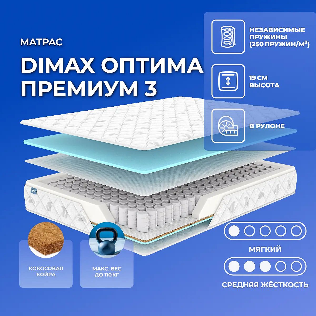 Матрас Оптима Премиум 3 рассчитан на нагрузку не более 110 кг на одно спальное место.