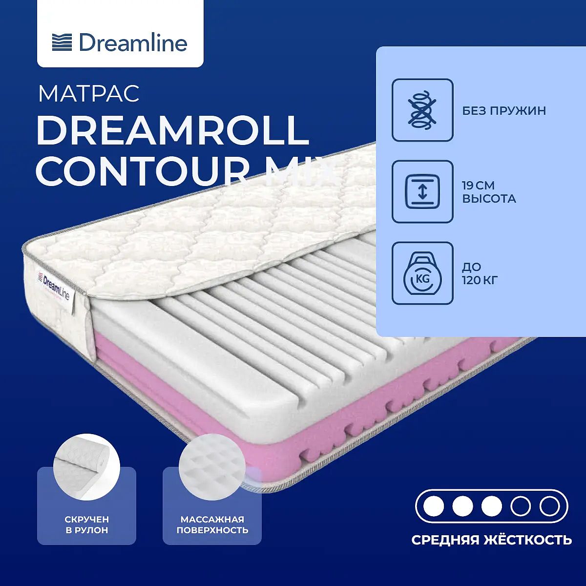 Матрас DreamLine DreamRoll Contour Mix — это беспружинный матрас средней жёсткости, обеспечивающий выверенный баланс поддержки и комфорта для ежедневного сна. В основе конструкции лежит 7-зонный искусственный латекс высотой 18 см с рельефной массажной поверхностью, который способствует расслаблению и помогает поддерживать правильное положение тела во время отдыха. Несъёмный чехол выполнен из хлопкового жаккарда «Lux», простёганного с холконом 200 г/м2. Такой чехол отличается мягкой фактурой, аккуратной отделкой и хорошей вентиляцией, сохраняя свежесть матраса на протяжении всего срока службы. Высота матраса составляет 19 см, а максимальная нагрузка на одно спальное место — до 120 кг. Благодаря одинаковой средней жёсткости с обеих сторон, матрас подходит для большинства пользователей и легко впишется в разные сценарии сна. Ключевые особенности
