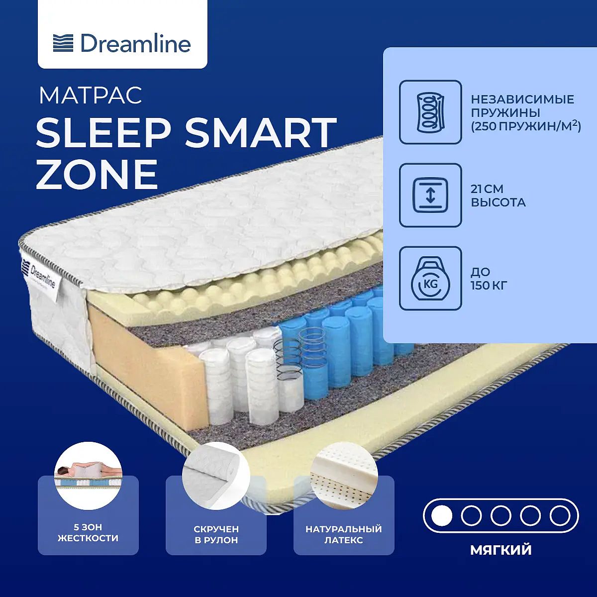 Высота, см: 21. Ограничение по максимальной нагрузке, кг: 150. Мягкая модель на основе натурального латекса на зональном пружинном блоке. Пружины, расположенные по зонамВся конструкция держится на пружинном пятизональном блоке. Каждая зона имеет свою жесткость и «работает» на соответствующую область тела спящего. Наиболее усиленные - поясничный и плечевой. Пружины в блоке выполнены в форме цилиндров, каждая упакована в отдельный тканевый чехол. Нагрузка распределяется равномерно по всей поверхности, а спящий получается поддержку всех зон.Расслабляющий материалМатрас мягкий, изготовлен на основе натурального латекса. Этот материал очень упругий и эластичный, он отлично расслабляет.Трикотажный чехолВ качестве ткани для чехла используется нежная трикотажная ткань Softech.Защита матрасаЕсли вы заботитесь о чистоте и свежести вашего спального места рекомендуем купить также защитный наматрасник-чехол или водонепроницаемый наматрасник.Скрутка в рулонПо умолчанию матрас поставляется в развернутом виде. По вашему желанию матрас может быть доставлен в скрученном виде.Другие моделиТакже вам могут быть интересны мягкие модели – Dreamline Memory Smart Zone и Dreamline Memory Latex Smart Zone.