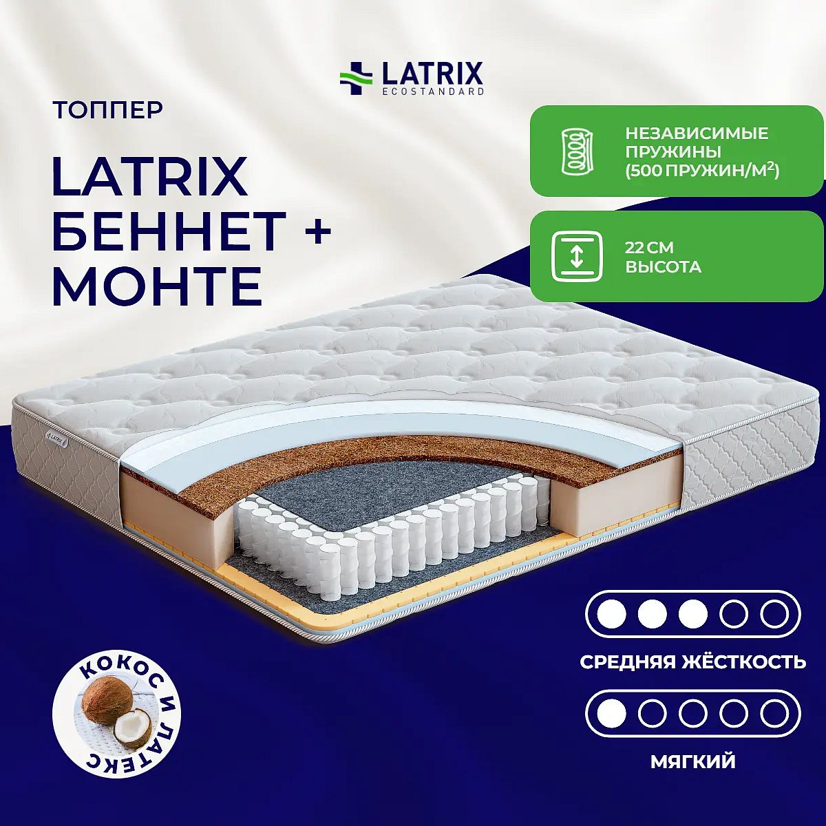Кокос — натуральный материал, койра отлично дышит, придает матрасу «Беннет + Монте» жесткость и упругость.