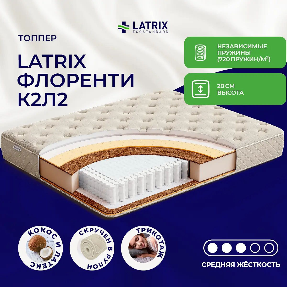 Ìàòðàñ «Latrix Ôëîðåíòè Ê2Ë2» — ñðåäíåé æåñòêîñòè, êîòîðàÿ êîìôîðòíà áîëüøèíñòâó ëþäåé ñðåäíåãî òåëîñëîæåíèÿ. Ýòî — óíèâåðñàëüíûé âàðèàíò è äåòÿì, è âçðîñëûì, è ïîæèëûì ëþäÿì.