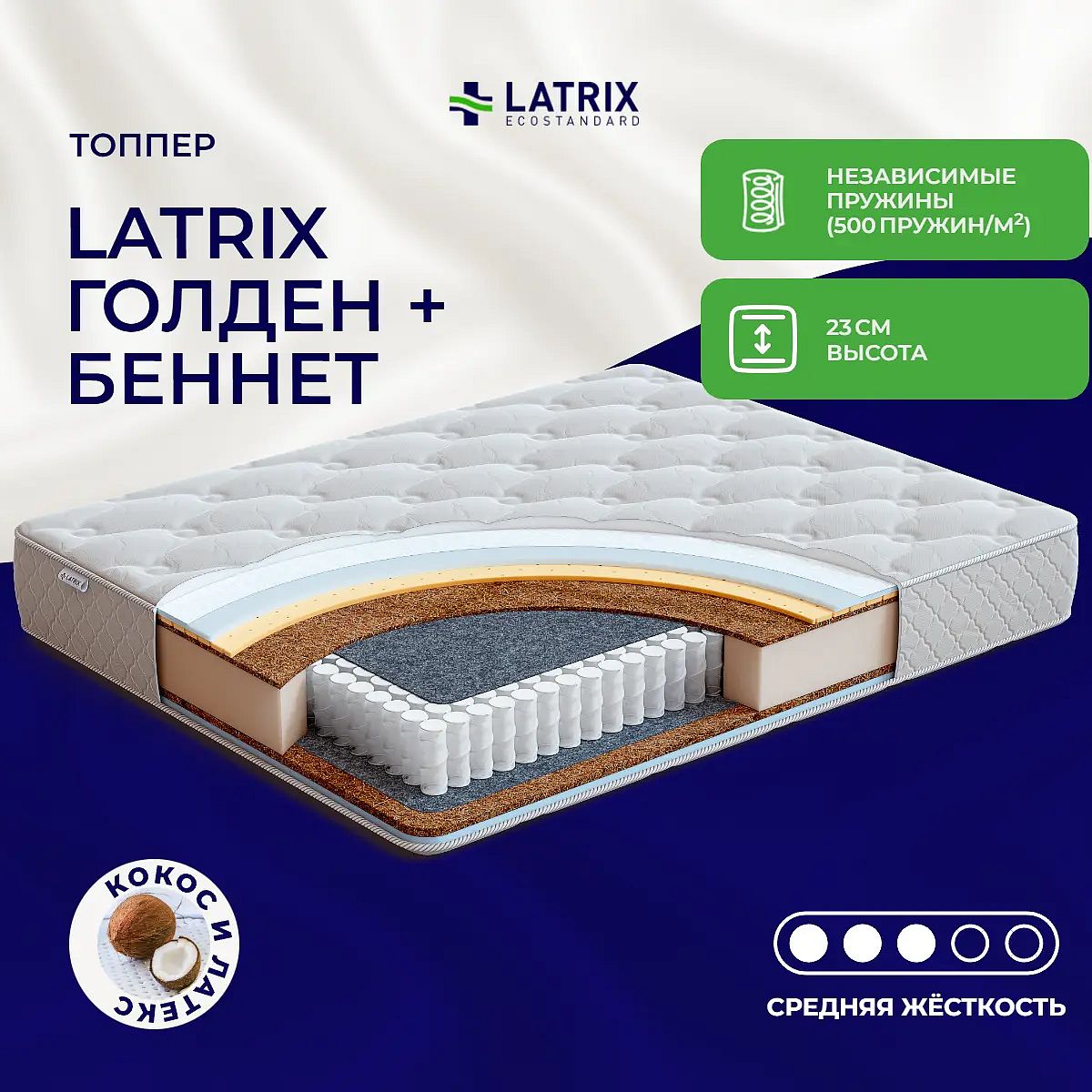 Матрас «Latrix Голден + Беннет» — средней жесткости, которая комфортна большинству людей среднего телосложения. Это — оптимальный вариант и детям, и взрослым, и пожилым людям.