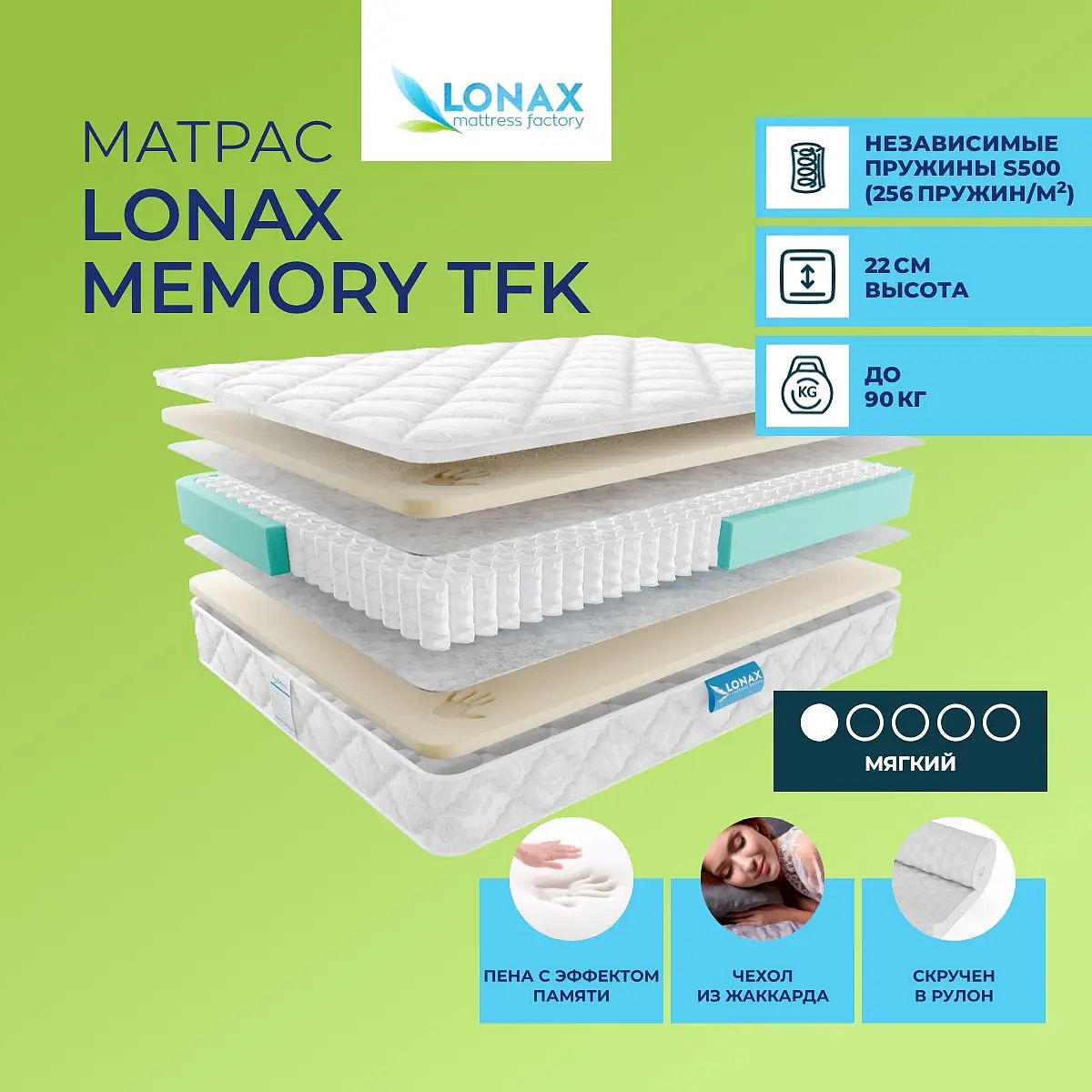 По умолчанию матрас поставляется в развернутом виде. По Вашему желанию матрас может быть скручен в рулон. Максимальный размер матраса, доступный для скрутки - 200х200. Комфортная модель на основе материала с эффектом памяти формы на микропружинах. Наполнение моделиУникальная особенность модели – использование в его составе пены с эффектом памяти формы. Этот искусственный материал изначально использовался в русле космических исследований для снижения нагрузки на астронавтов. Мемориформ, как его еще называют, имеет способность повторять и запоминать изгибы тела человека, когда он находится на такой спальной поверхности. Затем, когда человек встает, на поверхности остается оттиск его тела. Мемориформ обеспечивает расслабление, снимает напряжение с различных участков тела. Он не содержит вредных примесей и не вызывает аллергии.Действие пружин TFKВ основе модели имеется пружинный блок TFK. Это более 500 микропружин на спальное место, каждая из которых помещена в «свой» чехол из прочного материала. За счет этого пружины способны воздействовать на тело спящего точечно и равномерно распределять нагрузку по всей поверхности.Чехол из жаккардаЧехол модели представлен жаккардовой тканью, простеганной на синтепоне.Защита матрасаДля того, чтобы защитить поверхность матраса от загрязнений, пыли и влаги купите также защитный наматрасник–чехол или водонепроницаемый наматрасник. Он сохранит поверхность чистой и заметно увеличит срок службы матраса.Другие моделиМодель средне–жесткая, рекомендуем также посмотреть другую модель с мемориформ – Lonax Memory Medium TFK.