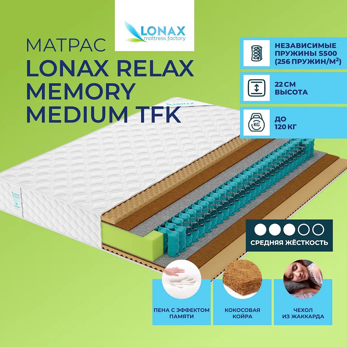 Матрас Lonax Relax Memory Medium TFK — это современный пружинный матрас средней жесткости, созданный для комфортного повседневного сна. Благодаря сочетанию независимых пружин TFK (256 пружин/м2), слоев мемориформ (пены с эффектом памяти) и кокосовой койры, матрас обеспечивает приятную упругость, точечную поддержку тела и адаптацию под индивидуальные контуры, снижая давление на поверхность. Высота изделия — 22 см, максимальная нагрузка на спальное место — до 120 кг. Мягкий хлопковый жаккардовый чехол простеган на синтепоне (200 г/м2), что обеспечивает приятные тактильные ощущения и аккуратный внешний вид. По периметру матраса — бортик из пенополиуретана для дополнительной поддержки формы. Свойства и преимущества