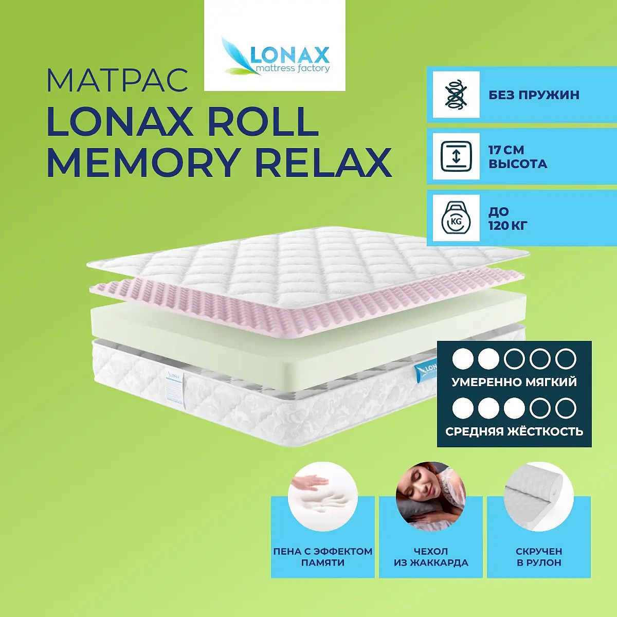Матрас Lonax Roll Memory Relax — это качественный беспружинный матрас для повседневного сна, который сочетает умеренно-мягкую и среднюю жесткость. Благодаря двум разным сторонам, вы можете выбрать подходящий уровень поддержки, просто перевернув матрас. Верхний слой из мемориформ обеспечивает приятную мягкость и легкое ощущение невесомости, а основа из пенополиуретана высотой 14 см поддерживает спину и сохраняет форму. Чехол выполнен из хлопкового жаккарда — приятный к коже, дышащий и долговечный материал. Матрас поставляется в скрученном виде, что облегчает транспортировку и размещение даже в небольших помещениях. Максимальная нагрузка на спальное место — до 120 кг. Характеристики
