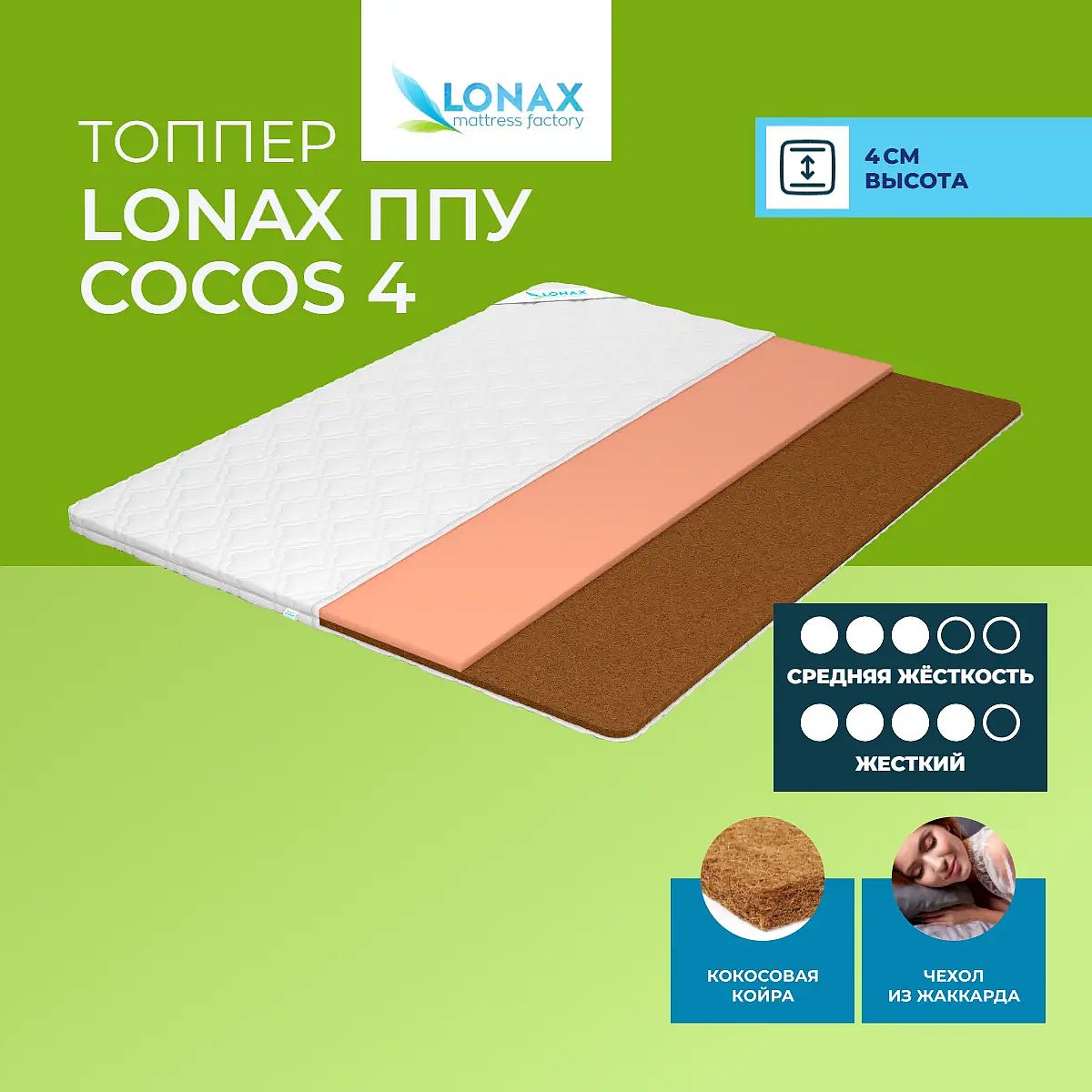 Тонкий матрас-топпер Lonax ППУ Cocos 4 поможет сделать спальное место более комфортным и адаптировать его под ваши предпочтения. Благодаря разным сторонам с отличающейся жесткостью (средняя и жесткая), вы сможете выбрать подходящий вариант поддержки для сна. Топпер подойдет для корректировки поверхности основного матраса, дивана или гостевого ложа, а также для выравнивания неровностей и повышения уровня комфорта. С одной стороны используется слой пенополиуретана (ППУ) толщиной 2 см — он придаёт мягкость и приятную упругость. Другая сторона выполнена из кокосовой койры (2 см), что обеспечивает дополнительную жёсткость и поддержку. Высота топпера — 4 см, что делает его универсальным решением для разных сценариев использования. Характеристики
