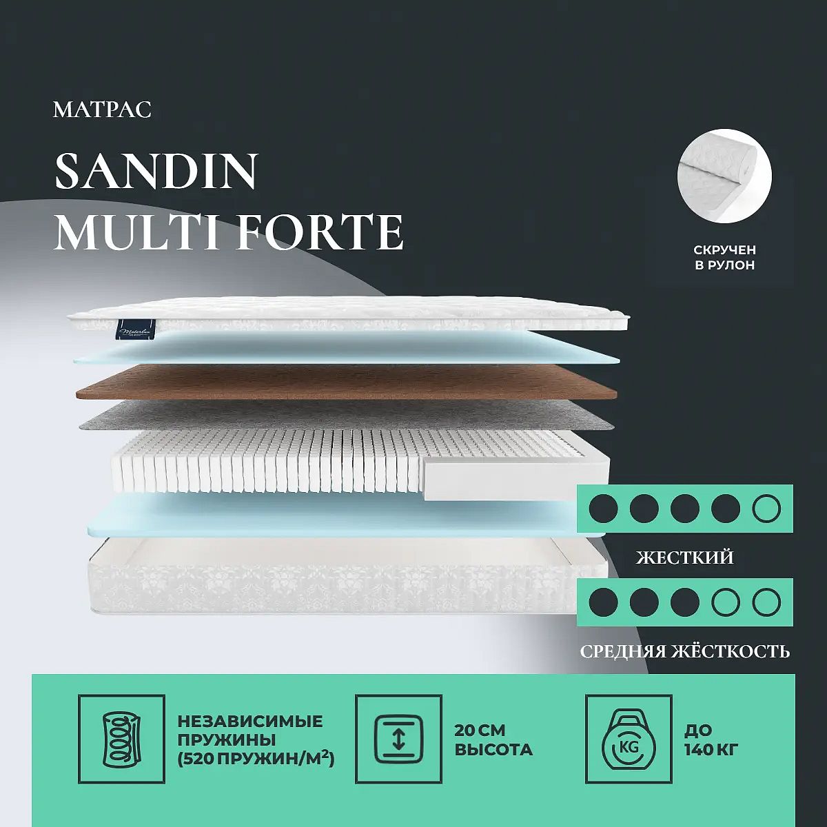 Матрас Sandin Multi Forte может доставляться как в полноразмерном виде, так и в скрученном. Данный матрас можно свернуть на фабрике в плотный рулон. Скрученный матрас удобно перевезти на дачу или просто забрать из магазина. Свернуть матрас повторно так же компактно в домашних условиях невозможно.