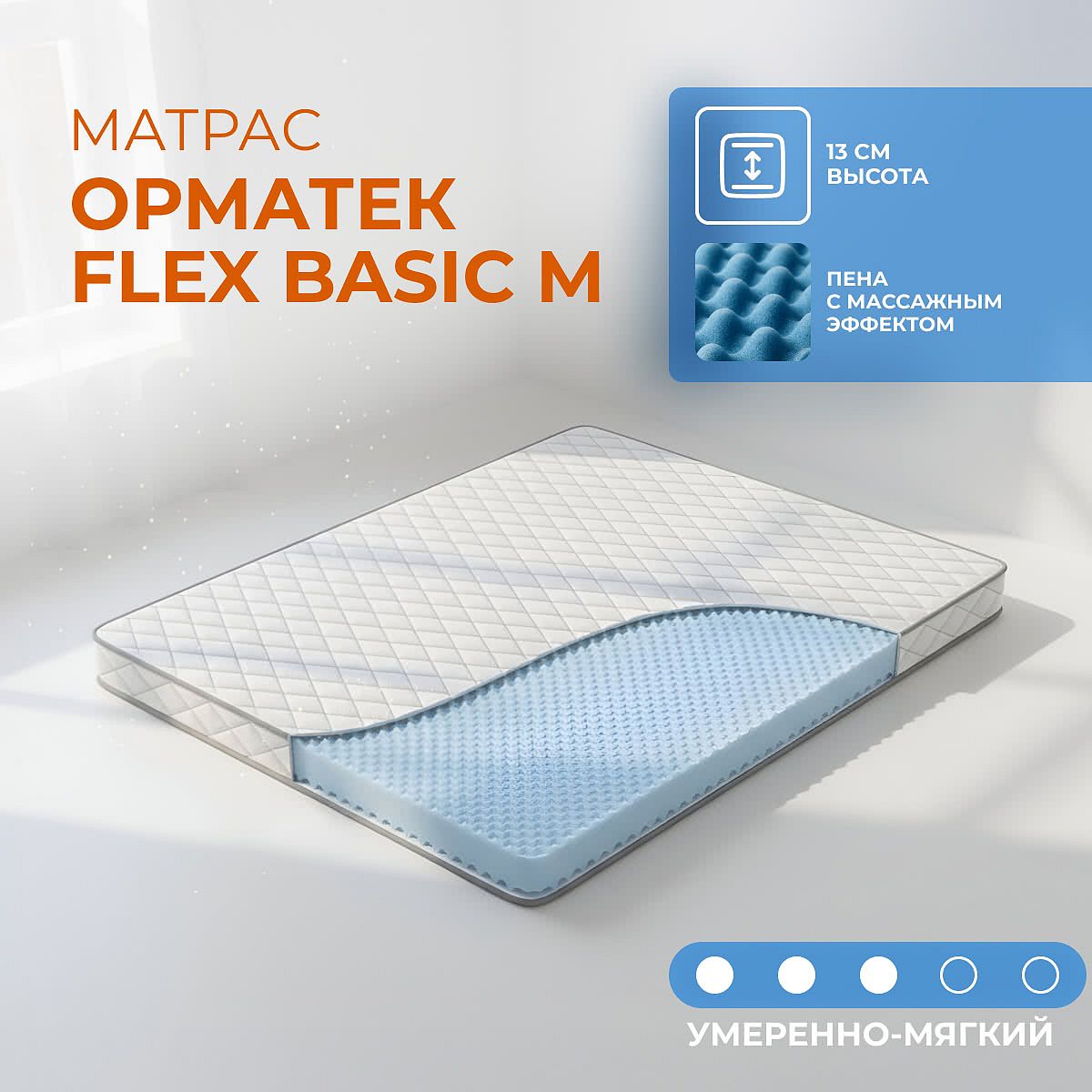изготовленных в соответствии с европейскими стандартами качества пен.Матрас Flex Basic – базовый беспружинный матрас для правильного сна и отдыха по доступной цене. Матрас хорошо переносит перепад температуры в холодный сезон и подходит для использования на даче. Беспружинный матрас с жесткостью ниже средней, изготовлен на основе современного материала Ormafoam с рельефной поверхностью, которая оказывает легкий массажный эффект и улучшает кровообращение. Для удобства транспортировки матрас скручен в рулон и помещен в вакуумную упаковку. Cрок хранения в скрученном виде не должен превышать 180 дней с даты выпуска. Состав матраса
