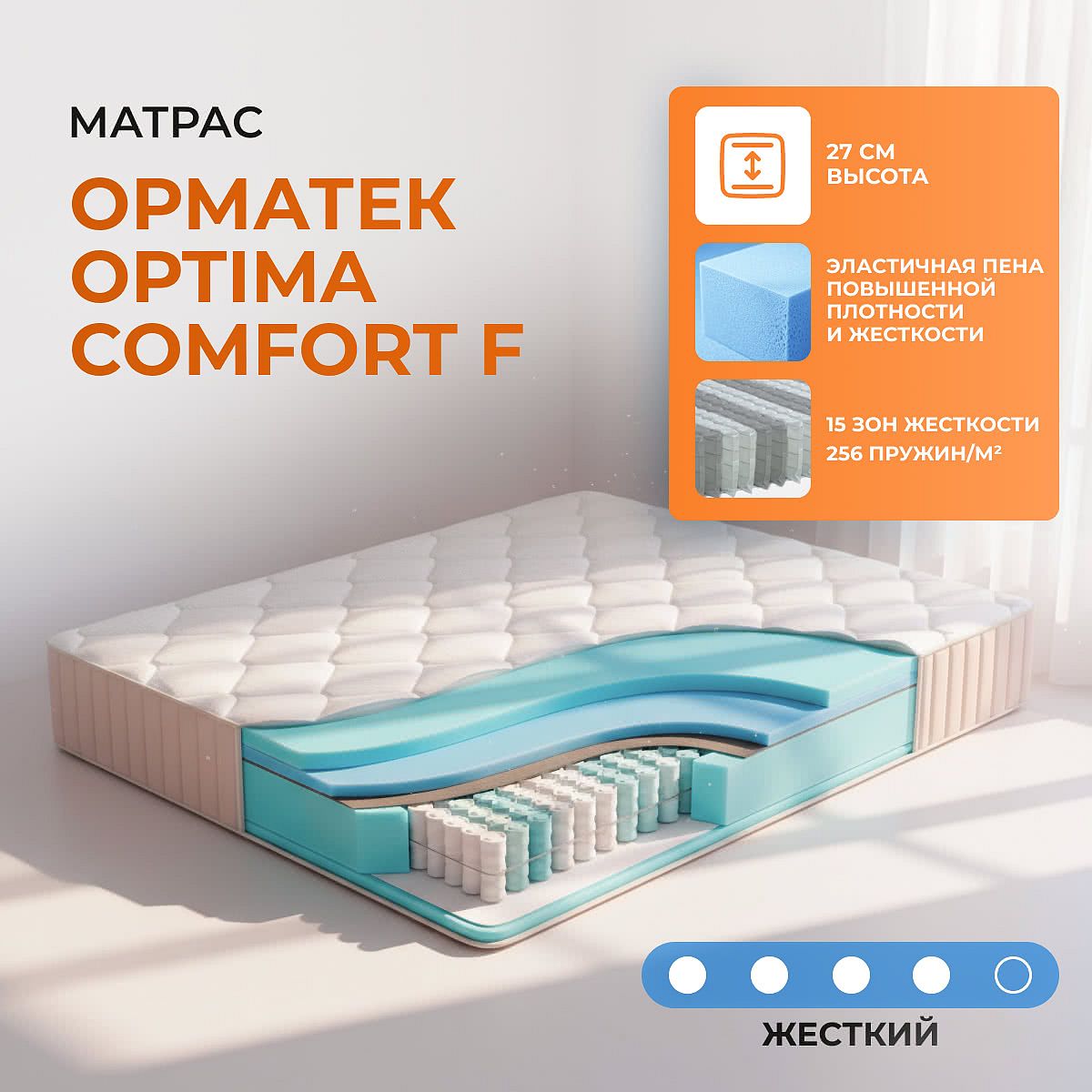Матрас Орматек Optima Comfort F — это односторонний пружинный матрас высокой жесткости, созданный для тех, кто ценит уверенную поддержку и комфорт во время сна. Модель сочетает современный мультизональный пружинный блок Smart Spring с 15 зонами жесткости и качественные пенные материалы разной плотности. Высота матраса — 27 см, что обеспечивает дополнительный уровень комфорта и позволяет быстро расслабиться после насыщенного дня. Мягкий чехол из трикотажа с вискозой простёган на эластичной пене и объёмном синтепоне, что дарит приятные тактильные ощущения, способствует терморегуляции и комфортному сну круглый год. Вискоза в составе чехла хорошо пропускает воздух и не накапливает статическое электричество, а бурлет из мебельной ткани защищает матрас от истирания. Состав и ощущения