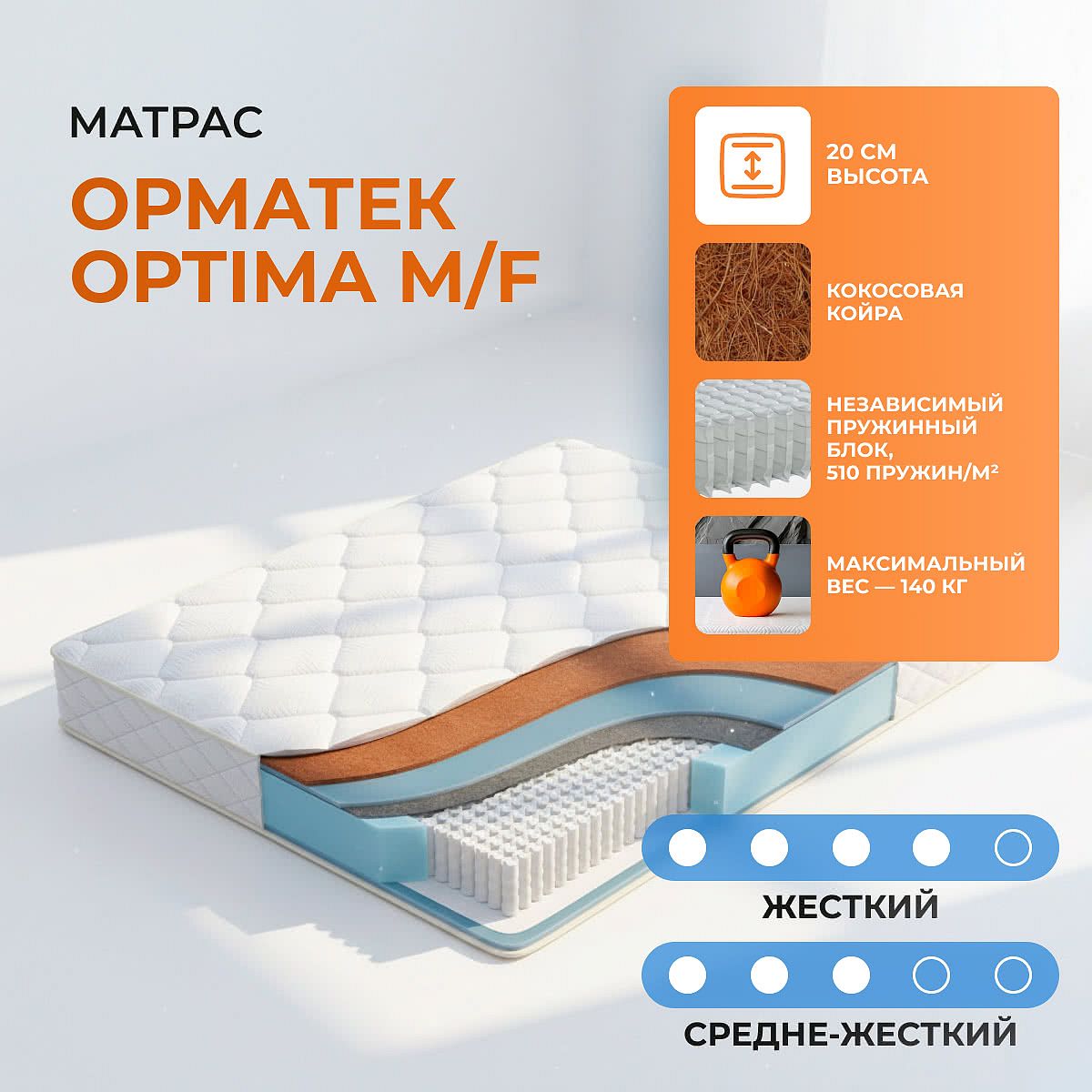 Матрас Орматек Optima M/F — это удобный пружинный матрас с разной степенью жесткости сторон, который позволяет подобрать оптимальный уровень комфорта для сна. С одной стороны матрас жесткий благодаря сочетанию кокосовой койры и Ormafoam, с другой — средней жесткости на основе Ormafoam. Такой подход особенно удобен для тех, кто предпочитает менять ощущения от сна или выбирает матрас для пары с разницей в весе. Основу матраса составляет независимый пружинный блок EVS 1000 с плотностью 510 пружин на м2. Это обеспечивает точечную поддержку позвоночника, равномерное распределение нагрузки и стабильную поверхность без эффекта «волны» даже при разнице в весе до 20 кг между спящими. Ключевые особенности