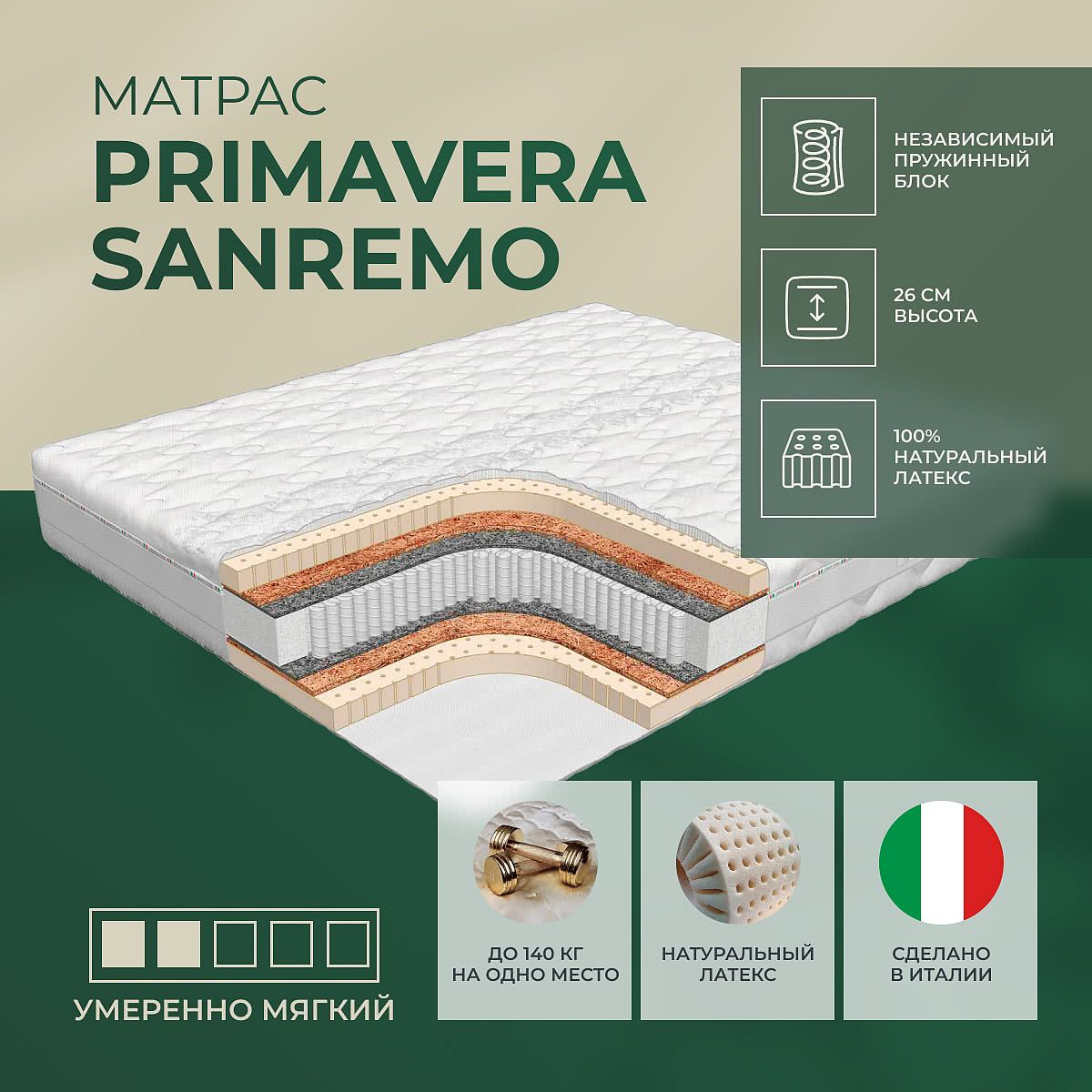Средне-мягкий матрас «Primavera Sanremo» просто создан для настоящего ценителя комфорта. Такой вариант хорошо подойдет людям с небольшим весом.