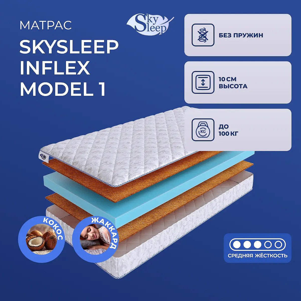 Матрас Skysleep InFlex Model 1 — это качественный беспружинный матрас средней жёсткости, который обеспечивает комфортную поддержку для сна. Сочетание натурального кокоса и эластичного ППУ формирует упругое, но в то же время приятное на ощупь спальное место. Такая конструкция помогает распределять нагрузку и подходит для большинства людей со средним телосложением. Высота матраса — 10 см, что делает его удобным для кроватей с невысоким бортиком или для использования как дополнительный слой комфорта. Чехол выполнен из хлопкового жаккарда со стёжкой на синтепоне (100 г/м2), материал приятен к коже и долго сохраняет аккуратный внешний вид. Ключевые особенности