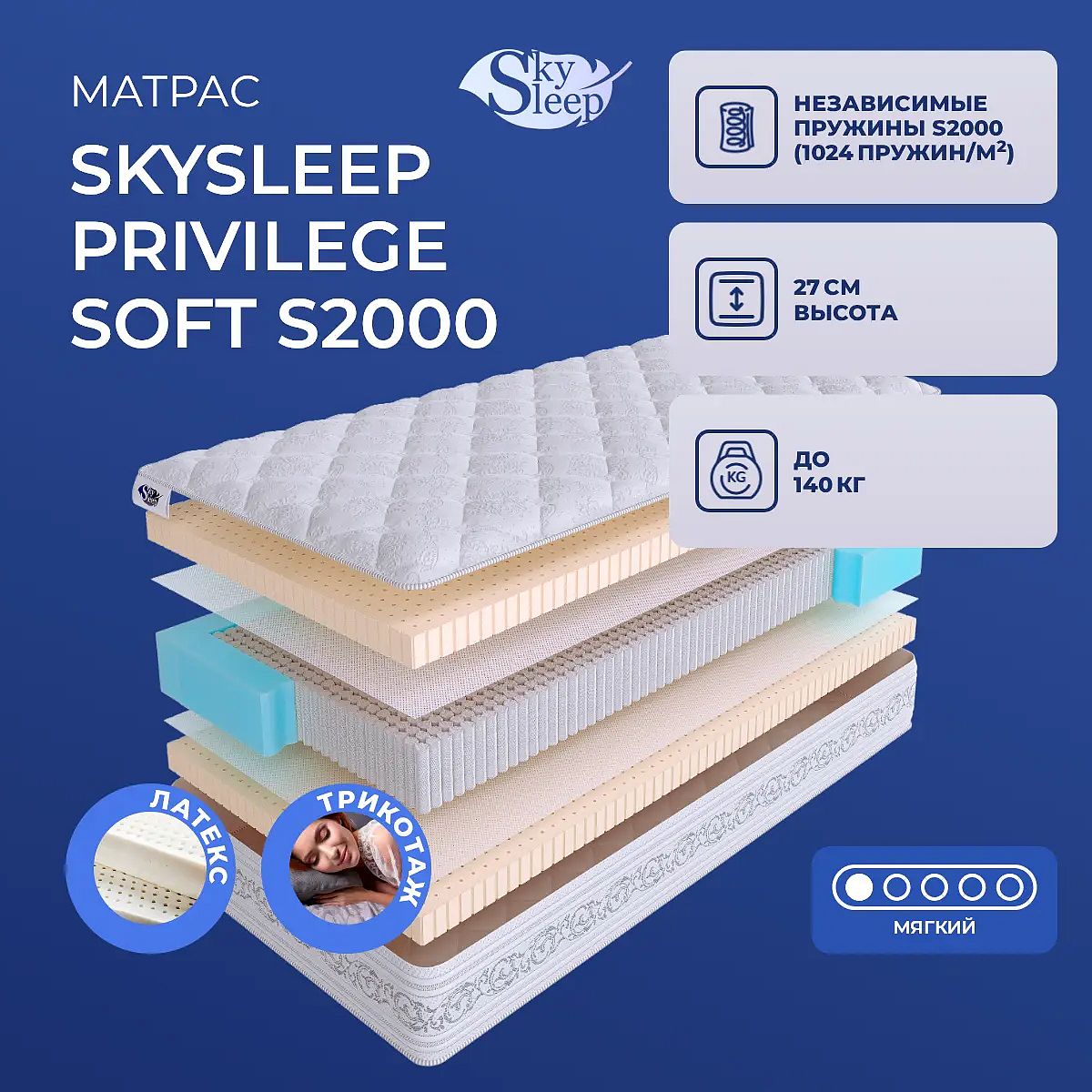 Матрас SkySleep Privilege Soft S2000 — это мягкий пружинный матрас люксового уровня, созданный для истинного комфорта и расслабления. Высота 27 см в сочетании с выразительной текстурой чехла придают спальному пространству ощущение статуса и заботы о деталях. Модель разработана для тех, кто ценит деликатную поддержку и нежные ощущения сна, и особенно подойдет тем, кто предпочитает мягкое спальное место. Благодаря симметричному строению и одинаковой мягкости с обеих сторон, матрас сохраняет свои свойства на протяжении всего срока службы. Максимальная нагрузка на спальное место — до 140 кг, что обеспечивает прочность и универсальность решения для спальни высокого класса. Ключевые особенности