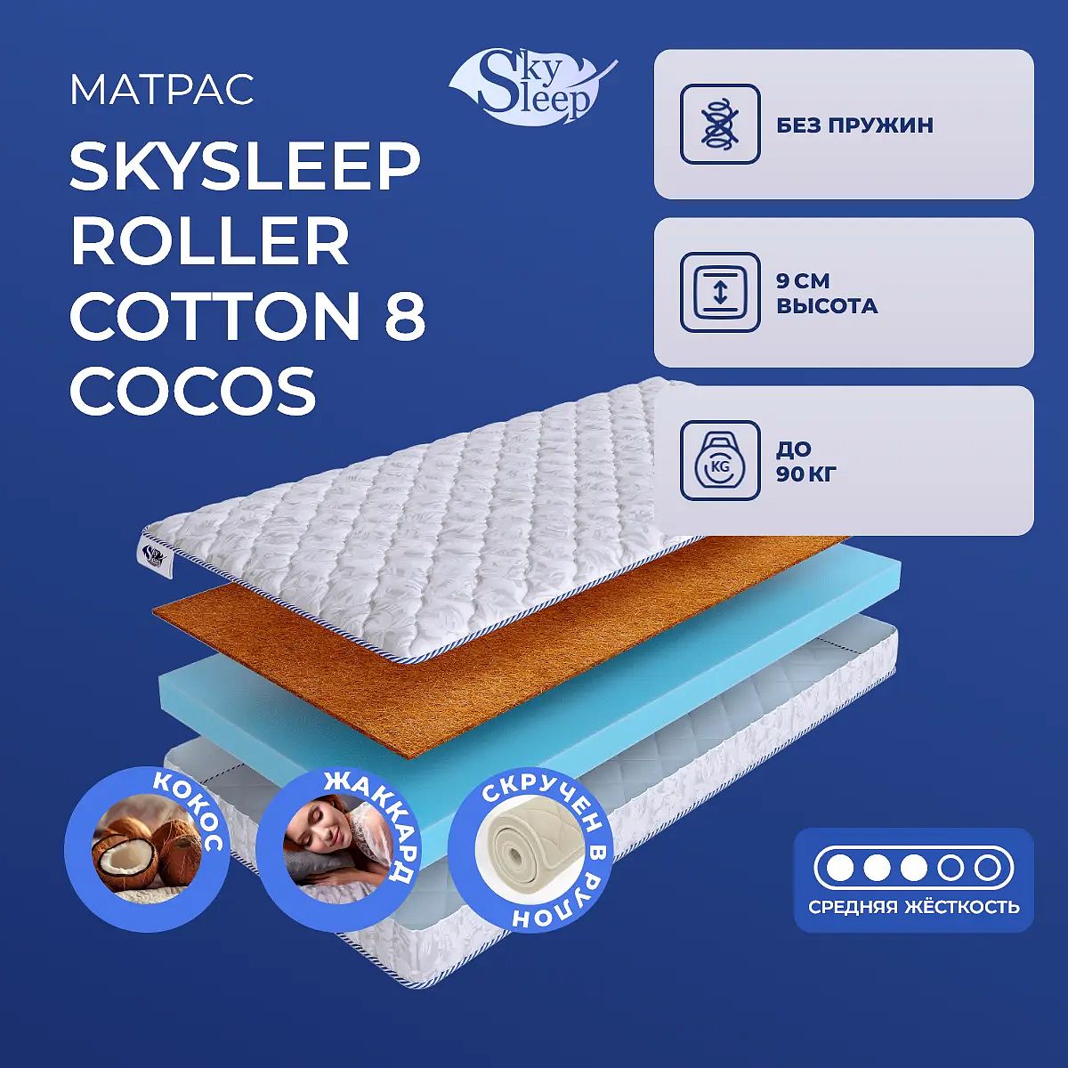 Матрас SkySleep Roller Cotton 8 Cocos — это беспружинный матрас с разными сторонами средней и выше средней жёсткости, созданный для комфортного сна и поддержки тела. Благодаря сочетанию кокосовой койры и слоя современного ППУ, матрас обеспечивает оптимальную упругость и надёжную опору позвоночнику, помогая сохранять естественное положение во время отдыха. Высота матраса 9 см делает его подходящим решением для кроватей с невысокой рамой или использования в качестве дополнительного спального места. Чехол из хлопкового жаккарда приятен на ощупь и отличается прочностью, сохраняя аккуратный внешний вид даже при длительном использовании. Матрас поставляется скрученным в рулон, что облегчает транспортировку и перемещение. Ключевые особенности