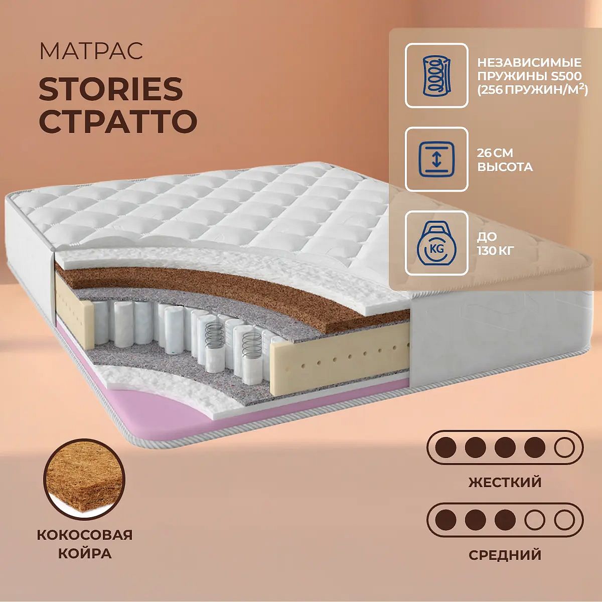 Матрас Stories Стратто — это пружинный матрас с разной степенью жёсткости сторон: одна сторона — жёсткая, вторая — средней жёсткости. Такой подход позволяет выбрать наиболее комфортную поддержку для сна и легко менять ощущения, просто перевернув матрас. Высота 26 см обеспечивает удобную посадку на кровати и гармонично смотрится в спальне. В основе матраса — блок независимых пружин TFK (256 пружин/м2), который обеспечивает точечную поддержку и равномерное распределение нагрузки до 130 кг на спальное место. Слой кокосовой койры придаёт жёсткость и упругость, а холлофайбер и современная пена обеспечивают мягкость и дополнительный комфорт. Чехол выполнен из хлопкового жаккарда с аккуратной стёжкой на холлоконе — это приятная на ощупь, прочная и хорошо дышащая ткань. Ключевые особенности