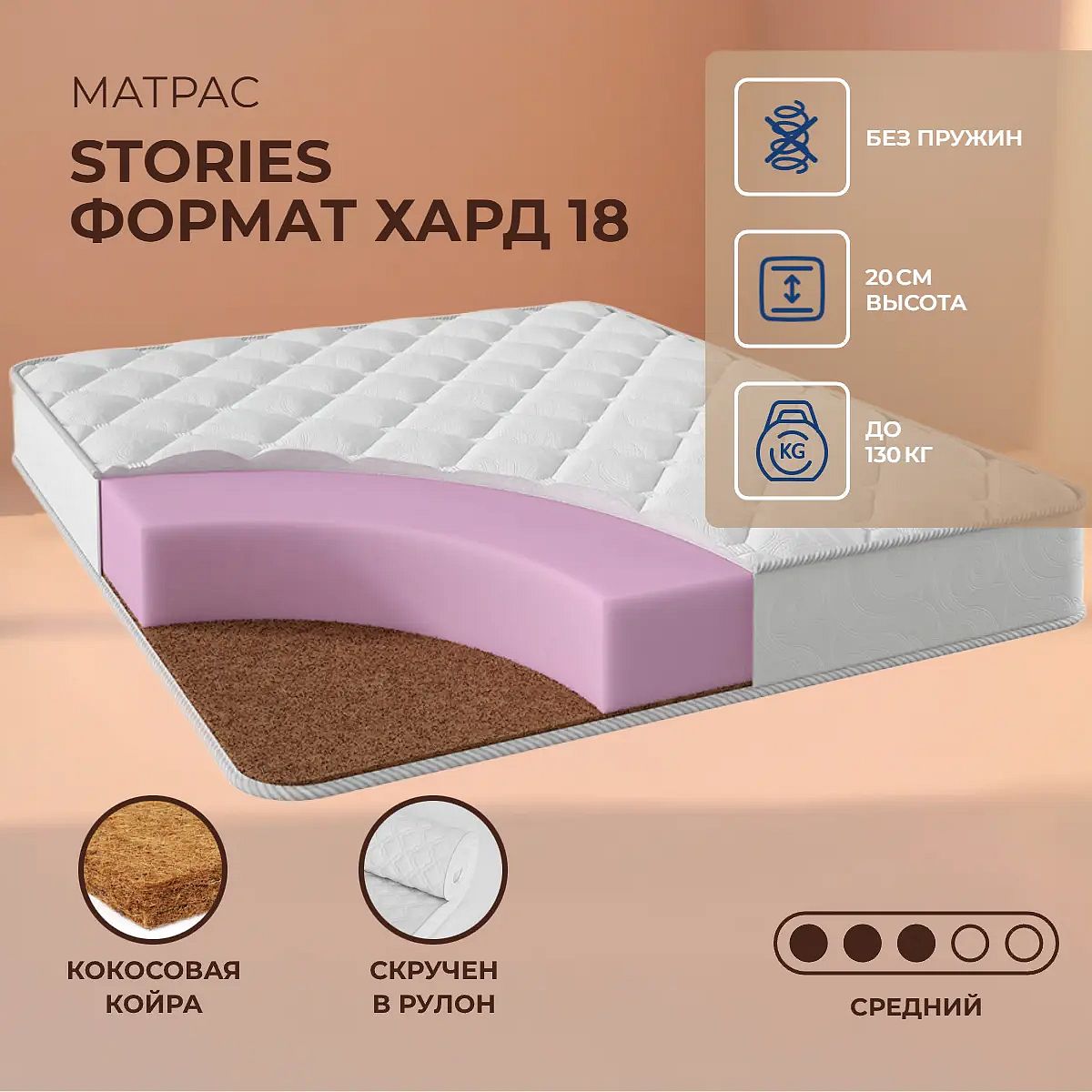 Матрас Stories Формат Хард 18 из коллекции Компакт — это современное решение для тех, кто ищет стабильную поддержку и комфорт в течение всей ночи. Благодаря сочетанию упругой пены (ППУ) и слоя кокосовой койры, матрас обеспечивает среднюю жёсткость с обеих сторон, сохраняя универсальность и удобство для большинства пользователей. Высота матраса составляет 20 см, что делает его подходящим для кроватей с различными основаниями и гарантирует приятные ощущения во время сна. Чехол выполнен из хлопкового жаккарда, простёганного на холконе, что добавляет мягкости и способствует хорошей циркуляции воздуха. Матрас подходит для людей с весом до 130 кг на одно спальное место и рассчитан на ежедневное использование в современных спальнях. Ключевые особенности