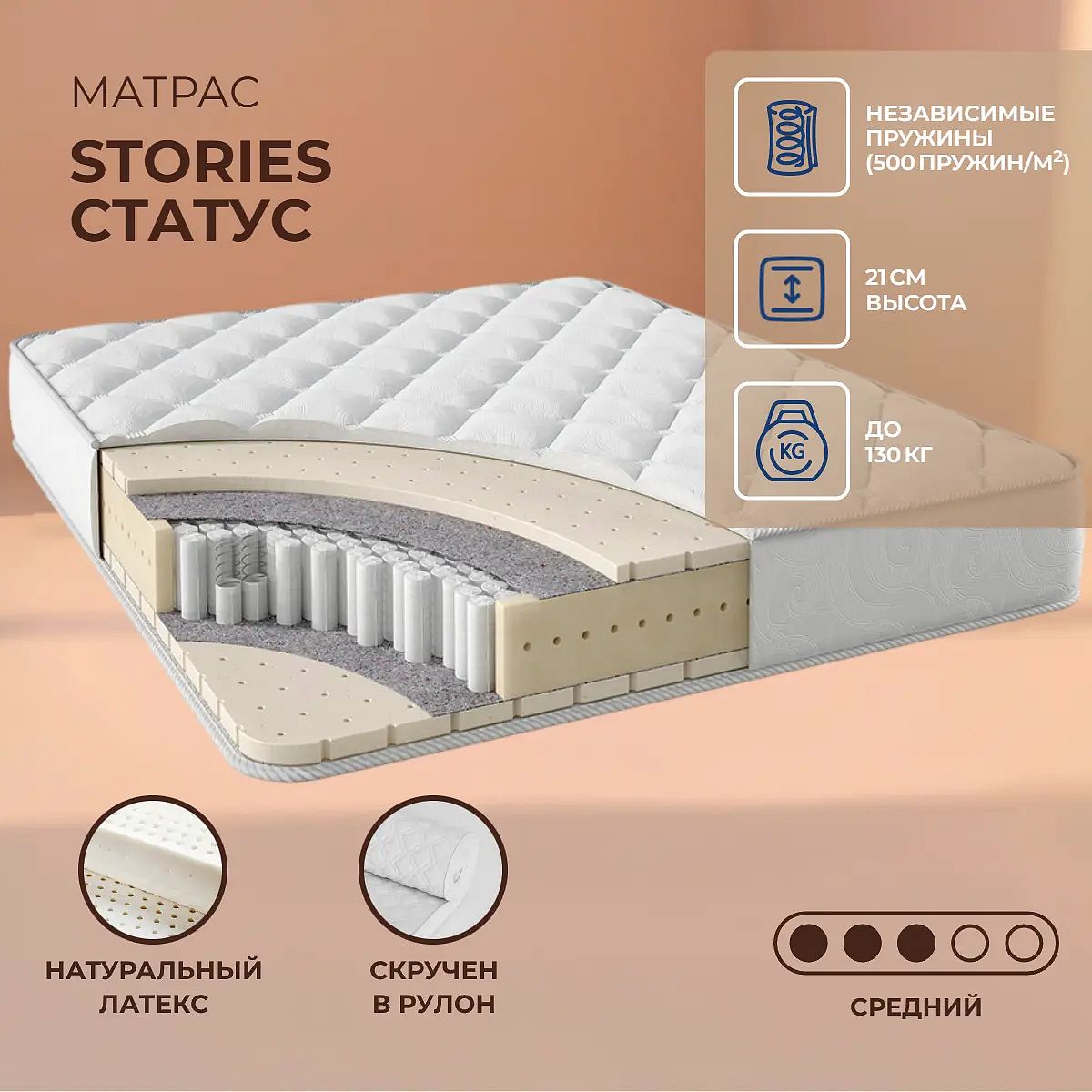 Матрас Stories Статус сочетает в себе выверенный баланс мягкости и поддержки, обеспечивая комфортный сон каждый день. Благодаря использованию блока независимых пружин S1000 (500 пружин на м2) матрас точно подстраивается под контуры тела и равномерно распределяет нагрузку. В составе обеих сторон матраса используется натуральный латекс толщиной 3 см — материал, который отличается упругостью, долговечностью и приятной эластичностью. Трикотажный чехол со стёжкой на холлконе (200 г) придаёт дополнительную мягкость и помогает поддерживать комфортный микроклимат во время сна. Матрас рассчитан на вес до 130 кг на спальное место и имеет универсальную высоту 21 см. Ключевые особенности