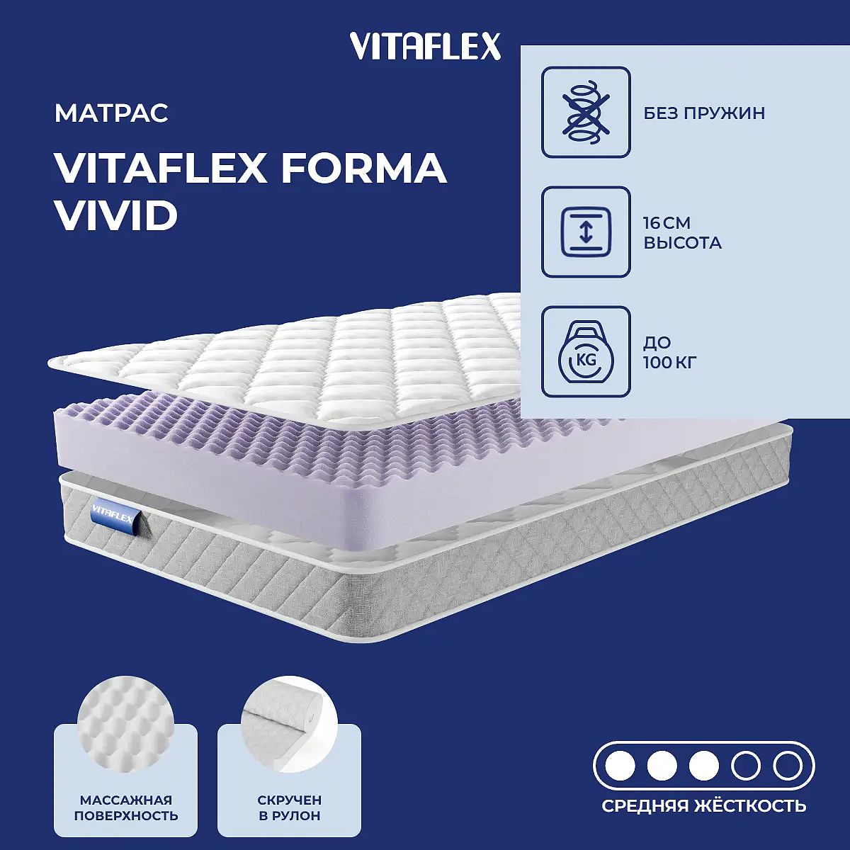 Матрас Vitaflex Forma Vivid — это современный беспружинный матрас средней жесткости для комфортного сна каждый день. Благодаря комбинации эластичной пены RelaxFoam высотой 16 см и чехлу из мягкого трикота, матрас обеспечивает приятную поддержку тела и помогает расслабиться после насыщенного дня. Рельефная поверхность ППУ способствует лёгкому массажному эффекту, что делает отдых особенно качественным. Матрас рассчитан на нагрузку до 100 кг на спальное место, подходит для большинства людей среднего телосложения и отлично справляется с повседневными задачами. Чехол выполнен из трикота с аккуратной стёжкой на синтепоне (100 г), что придаёт изделию дополнительный комфорт и привлекательный внешний вид. Серая окантовка делает дизайн универсальным для разных спален. Возможна доставка в скрученном виде, что удобно для транспортировки и размещения. Характеристики