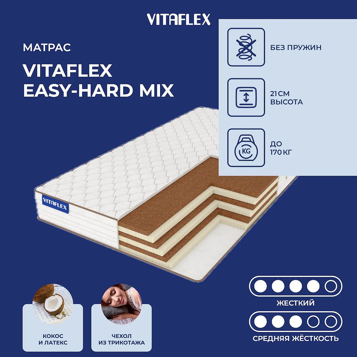 Преимущество матраса Easy-Hard Mix — он имеет 2 различные по жесткости стороны: жесткую и средне-жесткую.