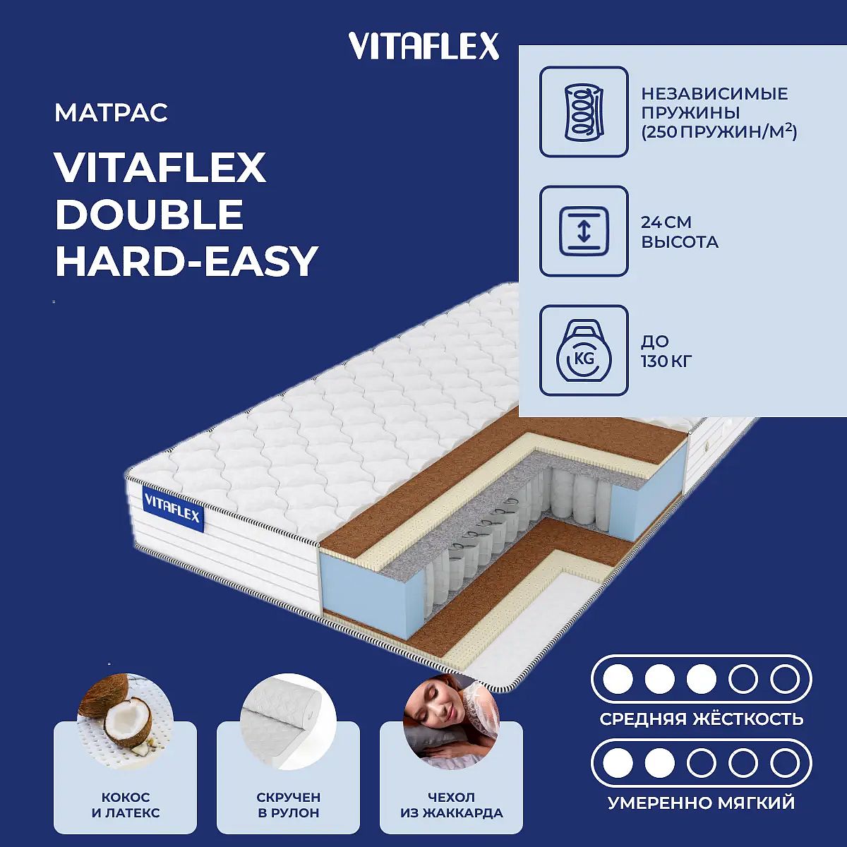 Матрас Double Hard-Easy с разной жесткостью сторон. Одна сторона – средняя, другая – умеренно-мягкая.Состав матраса: