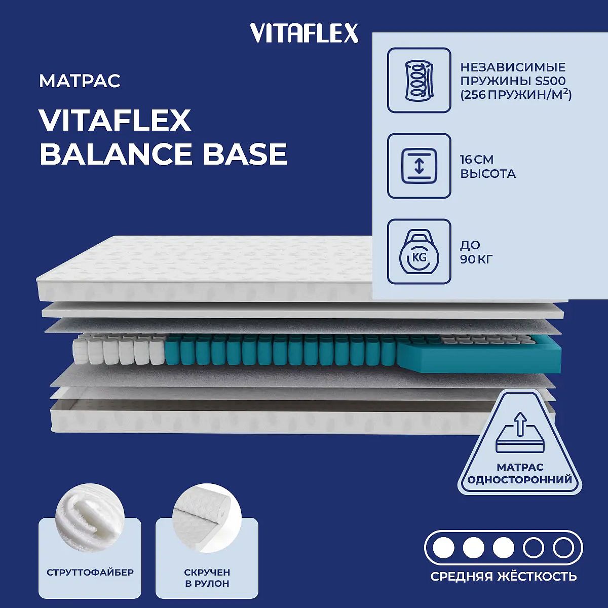 Матрас Vitaflex Balance Base — это односторонний пружинный матрас средней жесткости, разработанный для ежедневного комфортного сна. Сочетание независимых пружин S500 (256 пружин/м2) и современных наполнителей обеспечивает точечную поддержку тела и сохраняет упругость на протяжении всего срока службы. Высота матраса составляет 16 см, что делает его удобным для большинства стандартных кроватей. В качестве наполнителя используется струттофайбер толщиной 2 см и периотек, а также плотный войлок и спанбонд, что способствует равномерному распределению нагрузки. Чехол выполнен из эластичного трикота, простёганного на синтепоне (80 г/м2), что придаёт поверхности лёгкую мягкость и приятные тактильные ощущения. Матрас рассчитан на максимальную нагрузку до 90 кг на спальное место. Возможна поставка в рулоне по заказу, что удобно при транспортировке и размещении в спальне. Характеристики