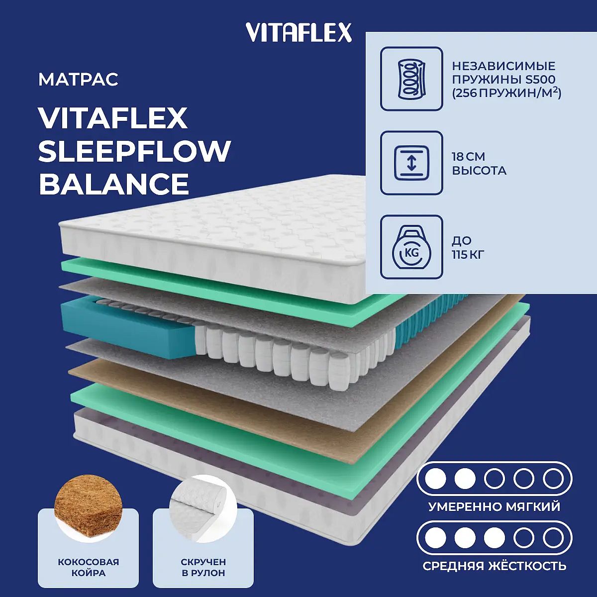 Матрас Vitaflex SleepFlow Balance — это современный двусторонний пружинный матрас с разной степенью жёсткости сторон. Одна сторона предлагает умеренно мягкую поверхность, вторая — среднюю жёсткость, что удобно для выбора наиболее комфортных ощущений во время сна. Высота матраса составляет 18 см, что обеспечивает удобную посадку на кровати. В основе — блок независимых пружин S500 (256 пружин на м2), который обеспечивает точечную поддержку, равномерно распределяет нагрузку и помогает телу сохранять правильное положение. Слой латексированного кокоса толщиной 1 см придаёт упругость и дополнительную поддержку, а высокоэластичный пенополиуретан (ППУ) обеспечивает мягкость и долговечность. Характеристики