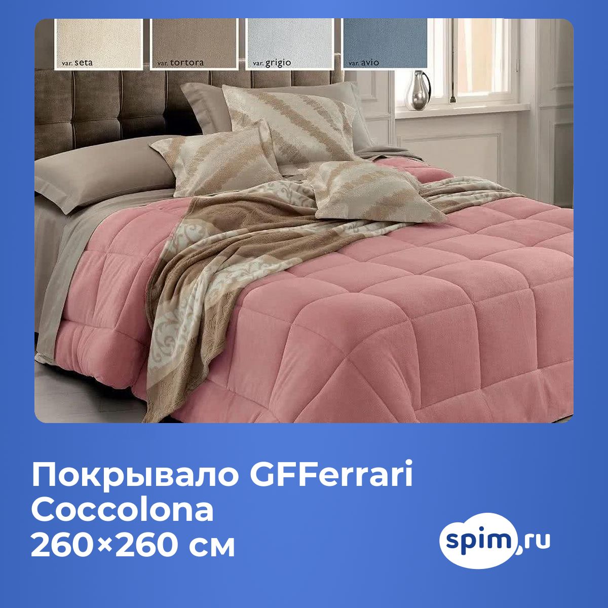 Советы по оформлениюПокрывало GFFerrari Coccolona представлено в нескольких расцветках, что позволяет подобрать подходящий вариант под интерьер вашей спальни. Однотонная поверхность хорошо сочетается как с яркими, так и с нейтральными комплектами постельного белья, а крупная стёжка гармонично смотрится с подушками разного формата. О производителеGFFerrari — итальянский бренд, специализирующийся на качественном текстиле для дома. Коллекция Coccolona сочетает современные материалы и практичный дизайн, что делает покрывала удобными для ежедневного использования и оформления спальни в современном стиле.